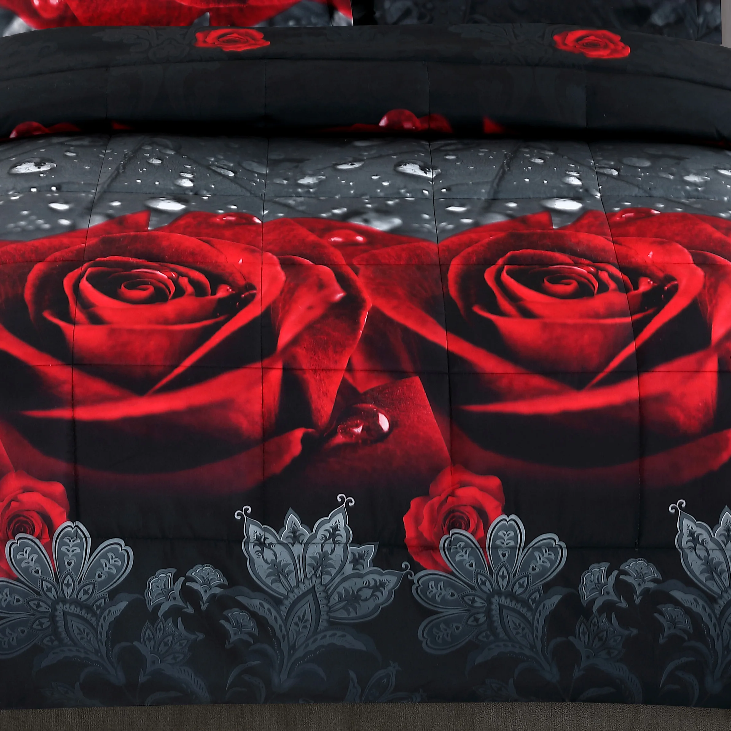 3D Red Rose Printed Comforter Set 3 Piece Queen Size Soft Microfiber Bedding Set Romantic Floral Bed Set with Pillowcases