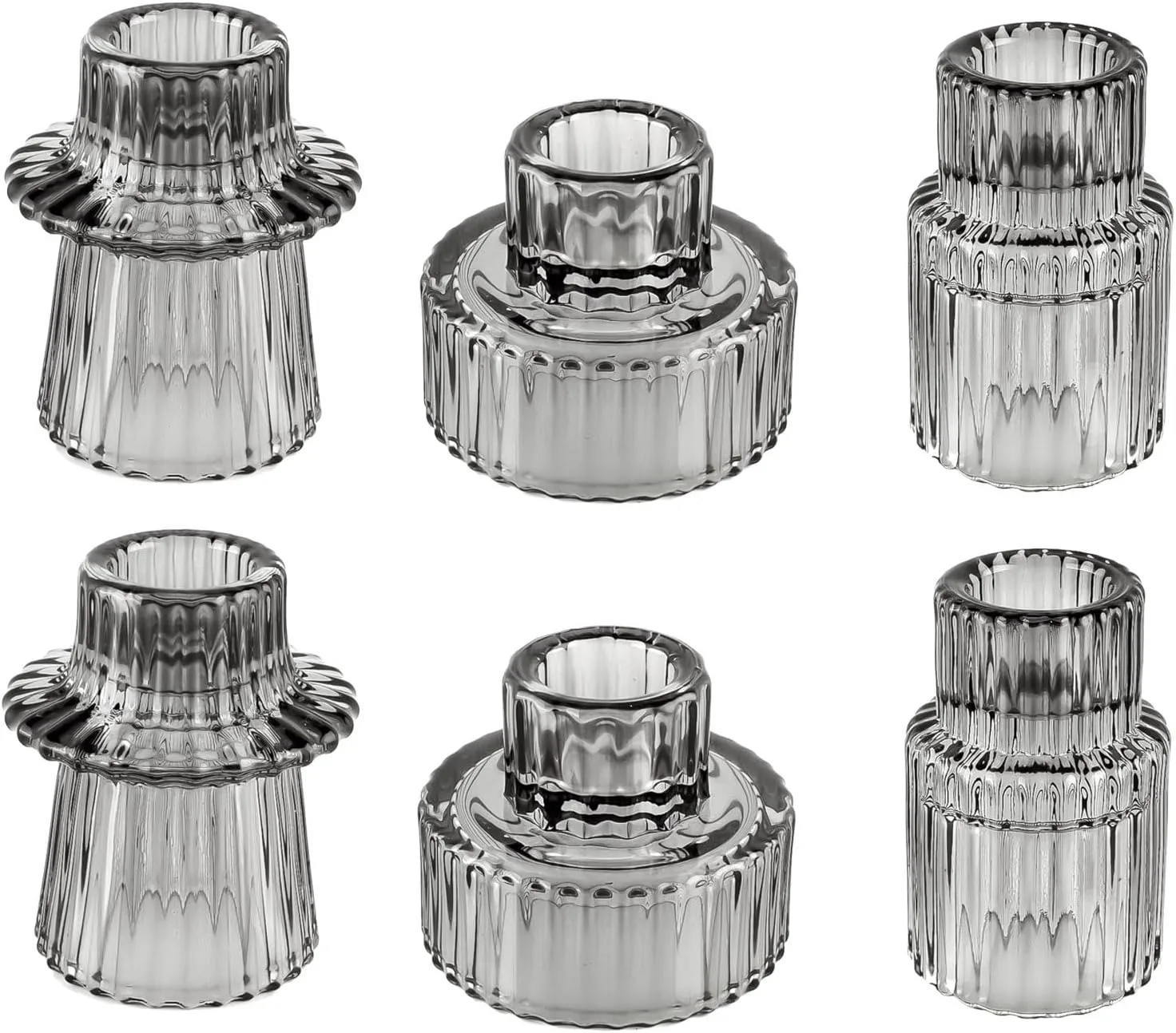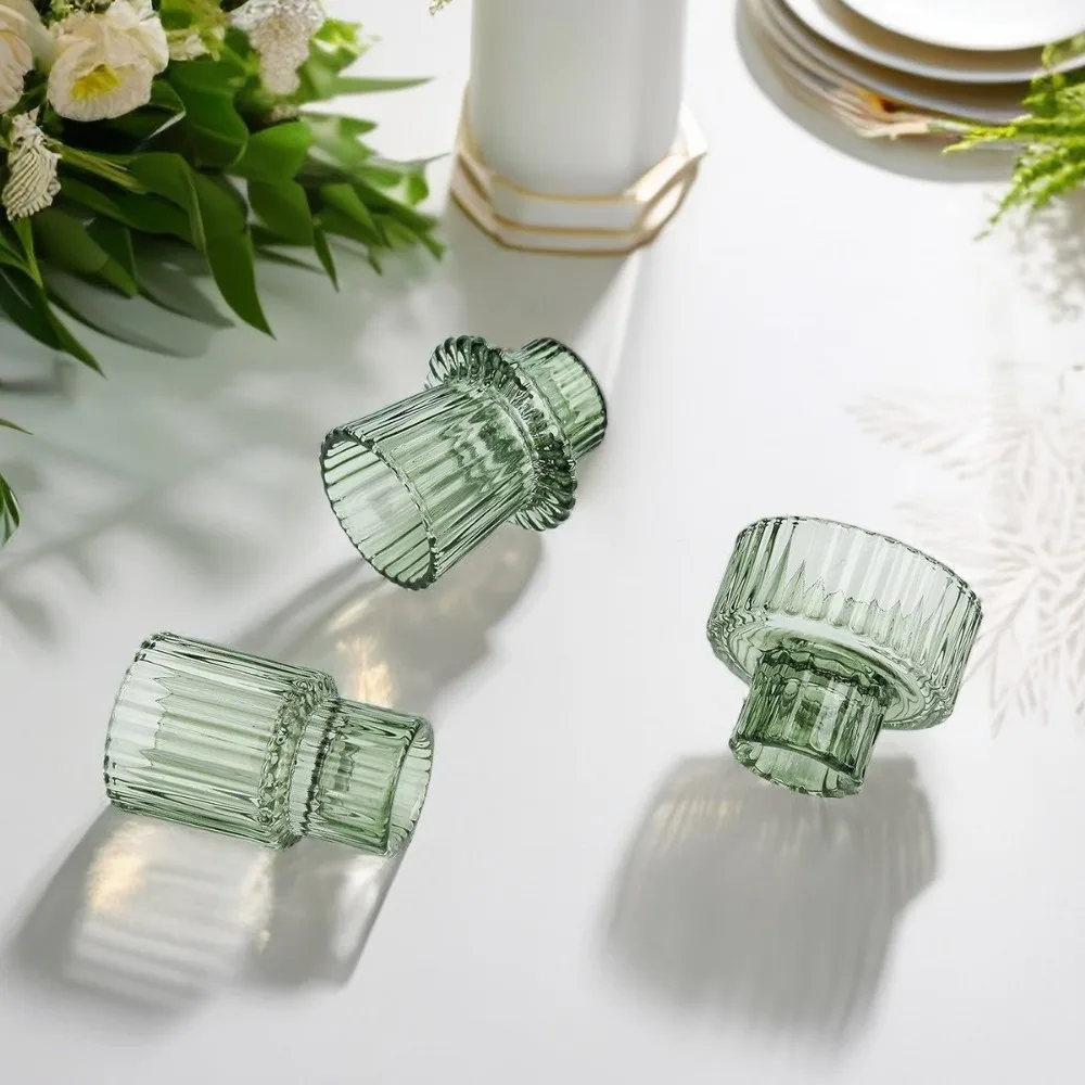 3Pcs Double Sided Vintage Ribbed Taper Glass Candle Holders for Table Centerpieces, Wedding Decorations Dinner Parties