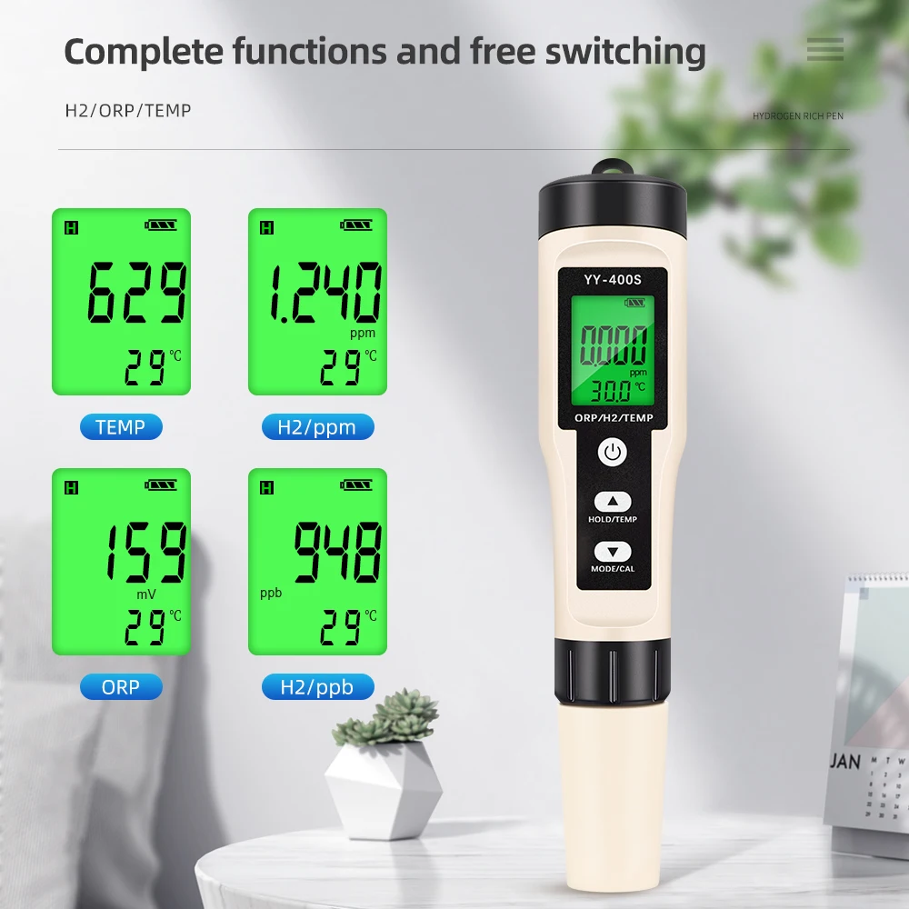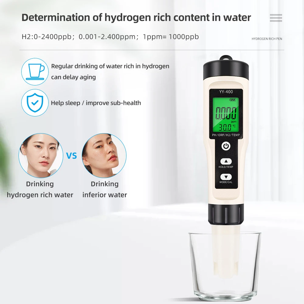 4 in 1 Water Tester Monitor H2 PH ORP TEMP Meter Reactive Oxygen Hydrogen Analyzer ATC 0-2400PPb for Aquariums Pools Spa