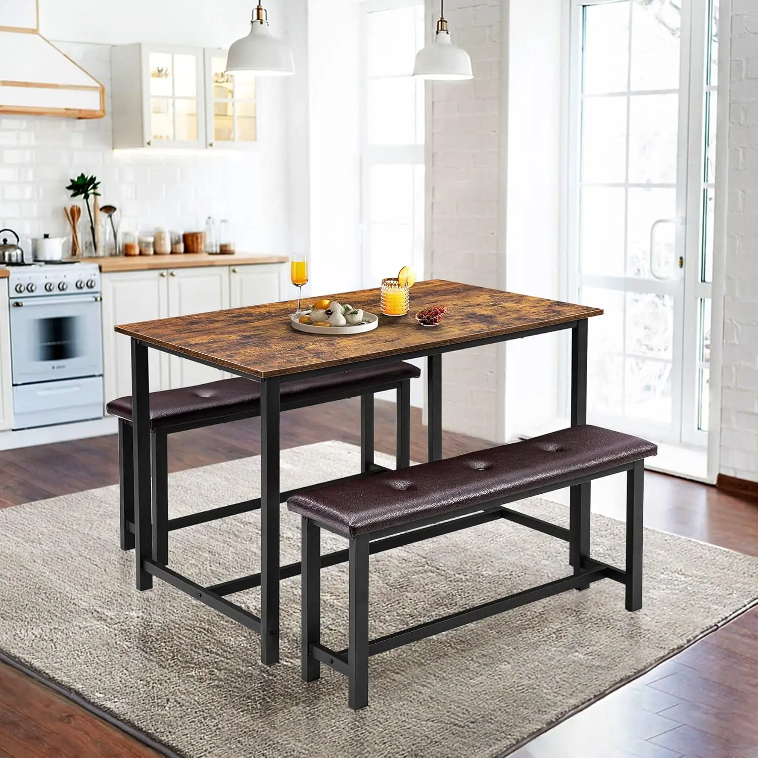 4-Person Kitchen Table Set with 2 Upholstered Benches Easy-Clean MDF Top & Steel Frame Compact Dining Room Set for Home Decor