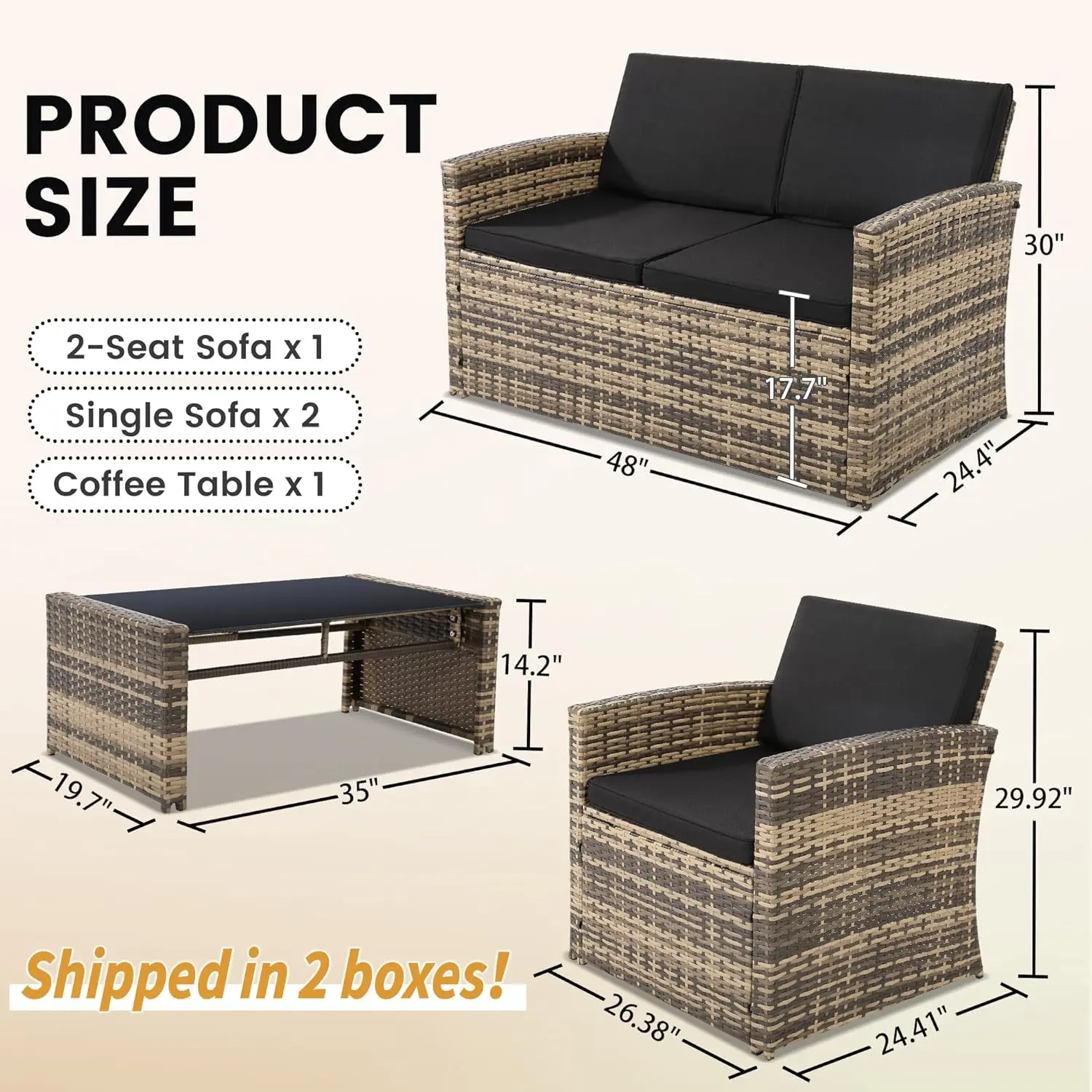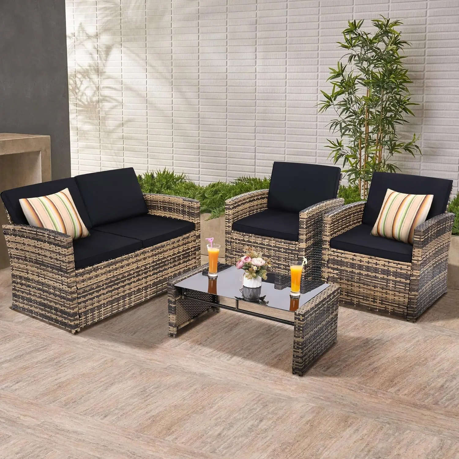 4-Piece Patio Wicker Rattan Sectional Sofa Cushions Glass Table All-Weather Garden Porch Backyard, Customized
