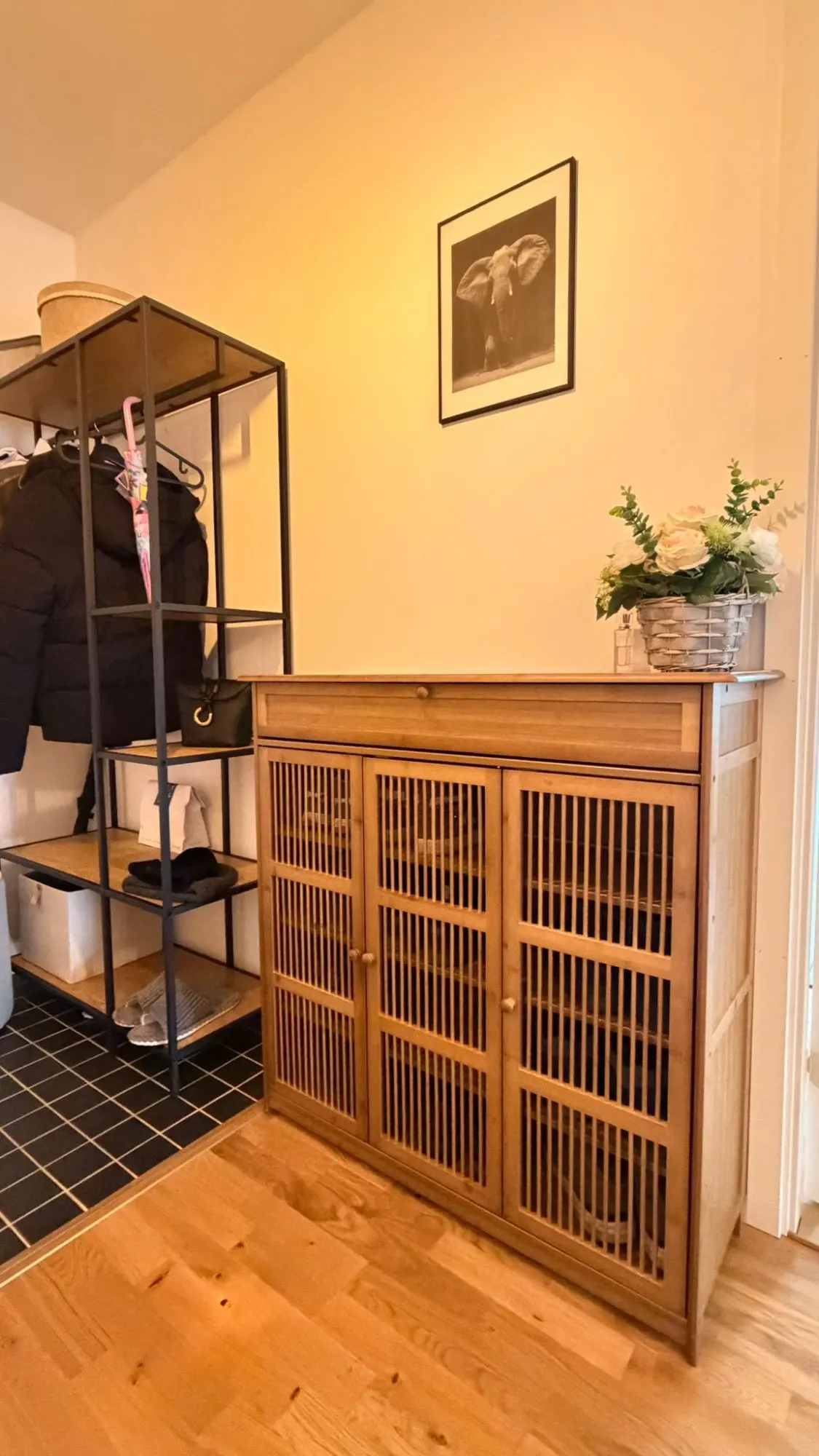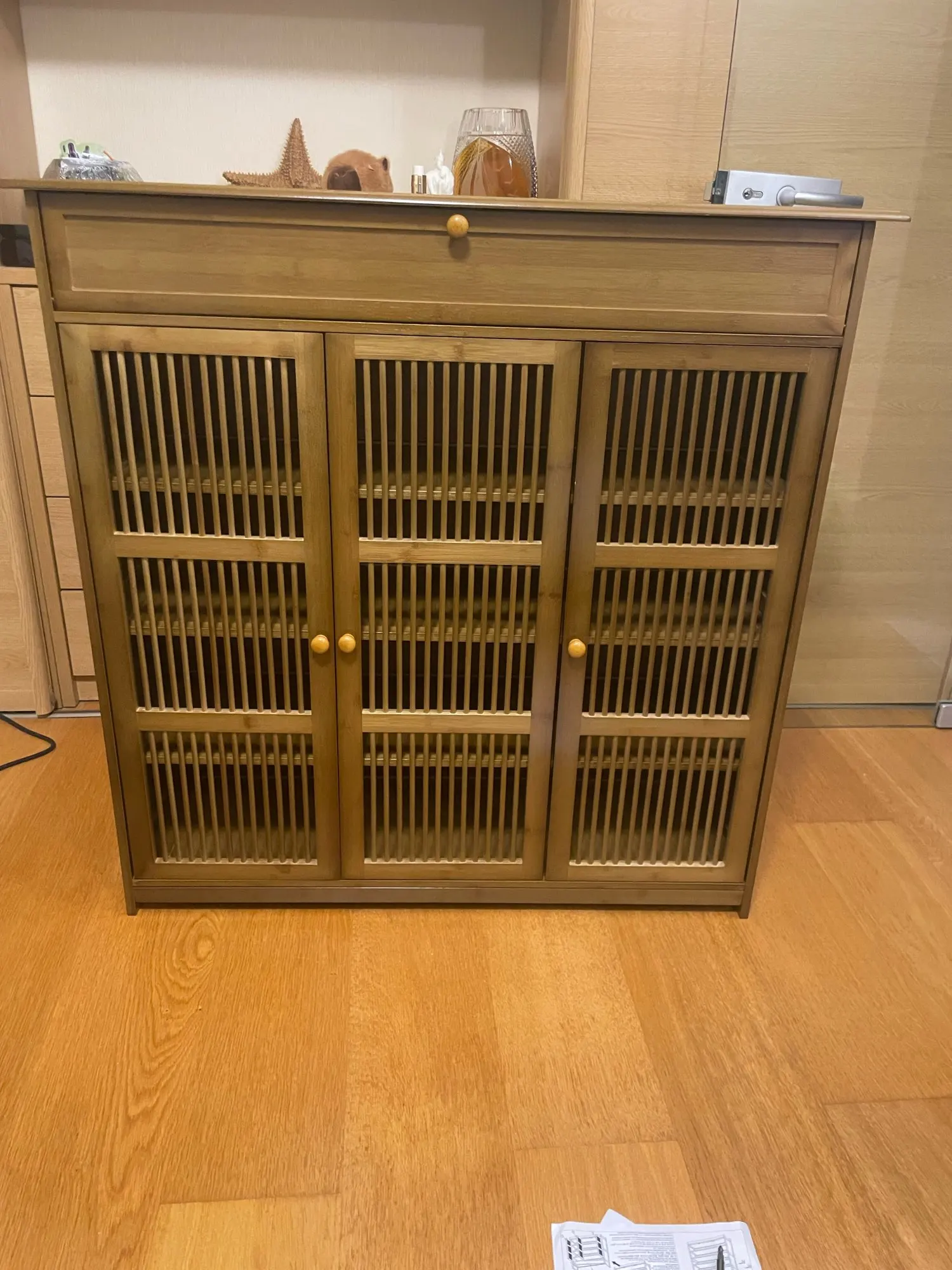 The package came damaged, luckily the furniture only had a small almost unnoticeable dent. I thought the top part was a drawer but it’s not, a bit wasted. I also thought the shelves could be adjusted in height, but no, there are boots that don’t fit me in height. The men’s shoes size 42, I have to tilt them a bit because they touch the rack. Overall satisfied.