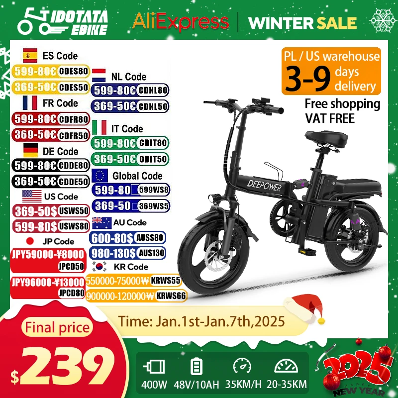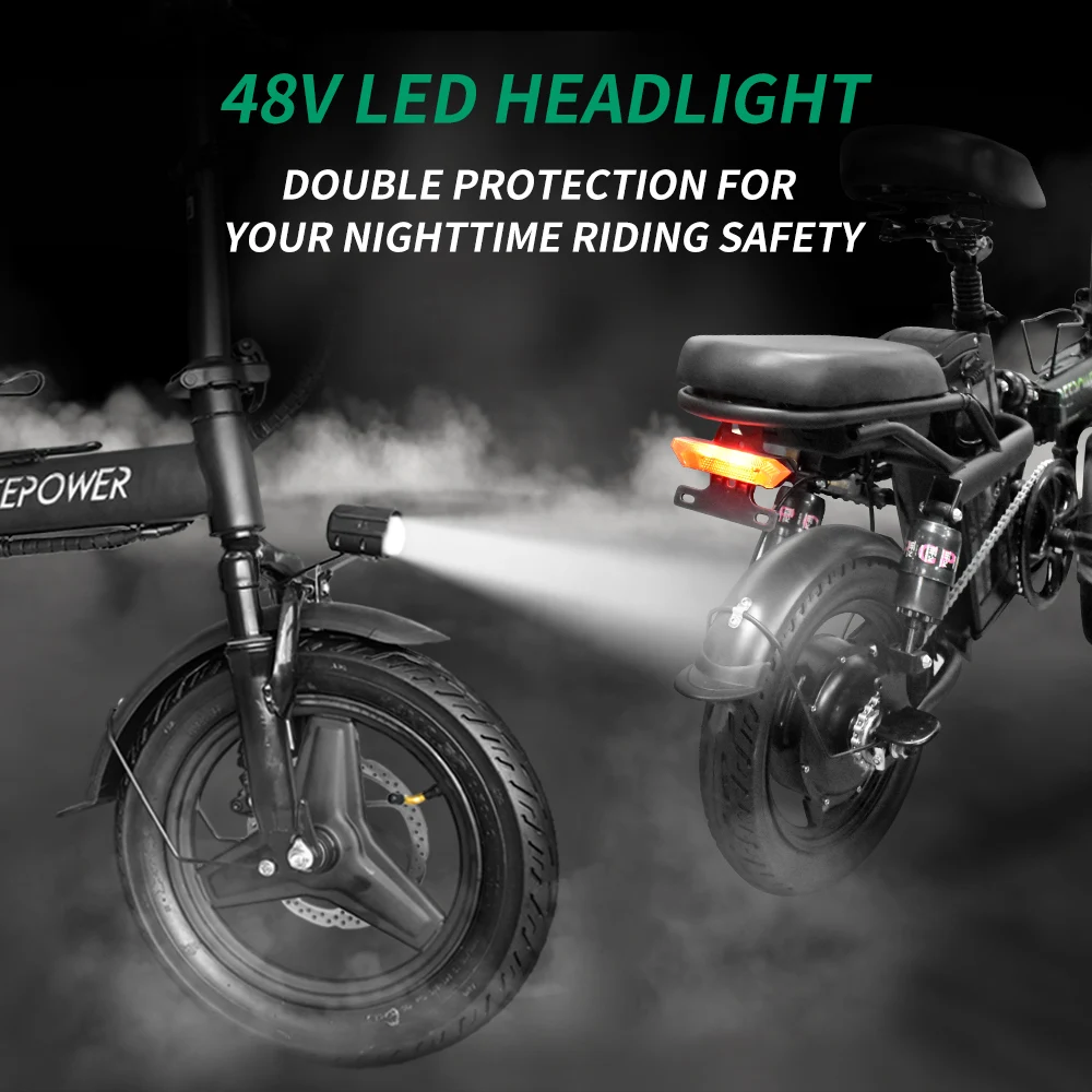 It comes with a 48 (54.6 V) 2A charger for faster charging of adult bikes, the actual charging time is 4 hours.14*2.125 explosion-proof vacuum tires (thicker and thickened rubber, anti-skid, wear-resistant, high drainage performance/efficiency).Bicycle is lightweight and folds easily.