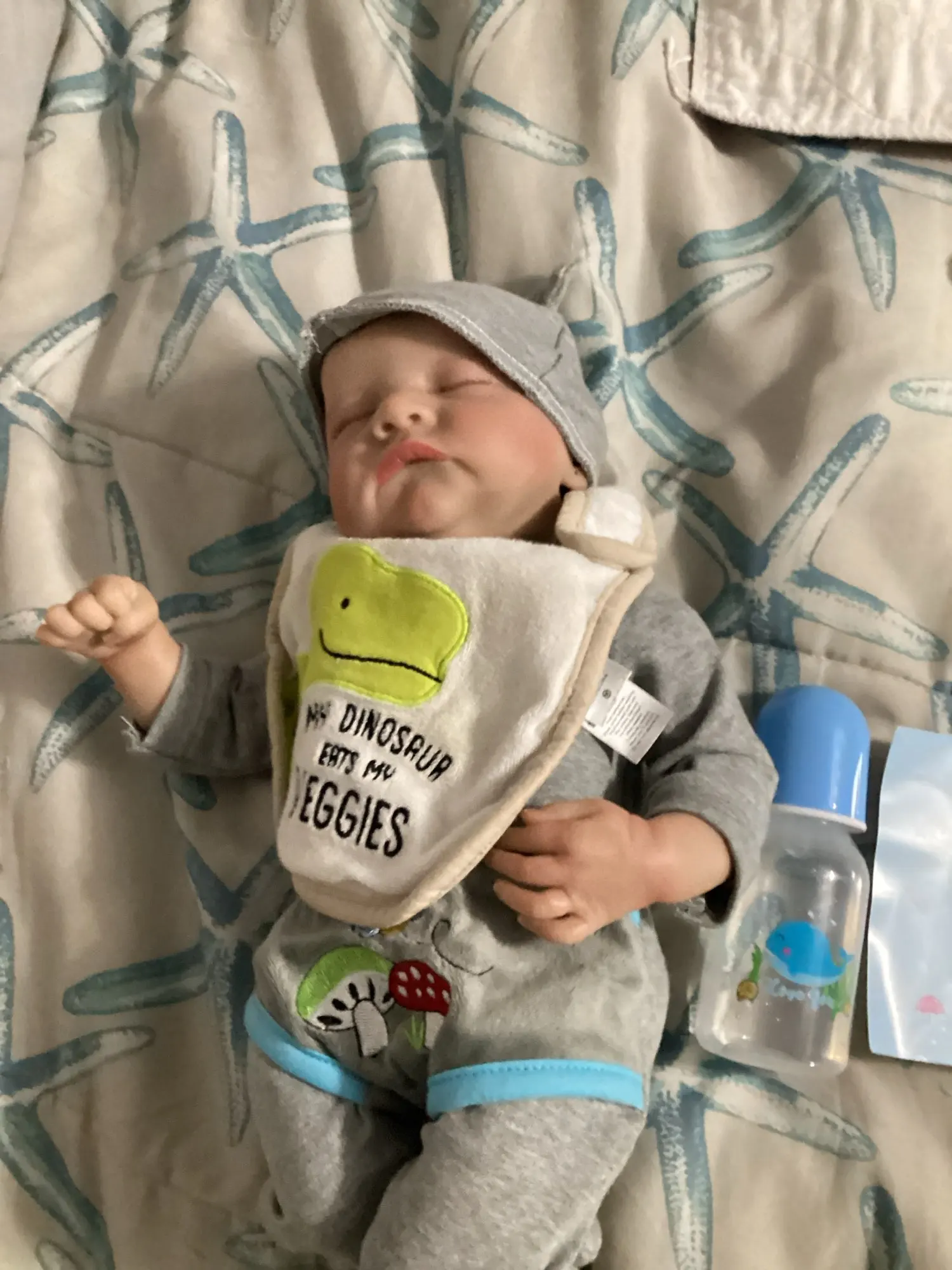 He is so cute, he centimeter naked though but his clothes and diaper were in the package, it also comes with a bottle and magnetic passifier and a birth cirtificut, he’s so cute i got him.in honor of my baby boy that died. He’s not silicone but still cute