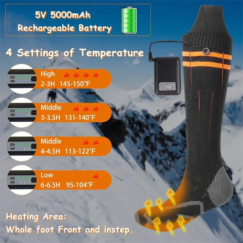 【5V 5000mAh Rechargeable Li-ion Batteries and Four Warming Levels】The battery heating socks are equipped with a pair of 5V 5000mAh rechargeable lithium batteries which the heating time is longer than that of the 2200mAh and 4000mAh batteries. This electric heating socks has four temperature settings: Low heat(35⁰C/149⁰F, 6.5 hours), Medium heat(45⁰C/113⁰F, 5 hours), Medium heat(55⁰C/131⁰F, 4.5 hours), High heat(65⁰C/149⁰F, 3 hours). Heating Up to 3-6.5 Hours and full charge around 3-4 hours.