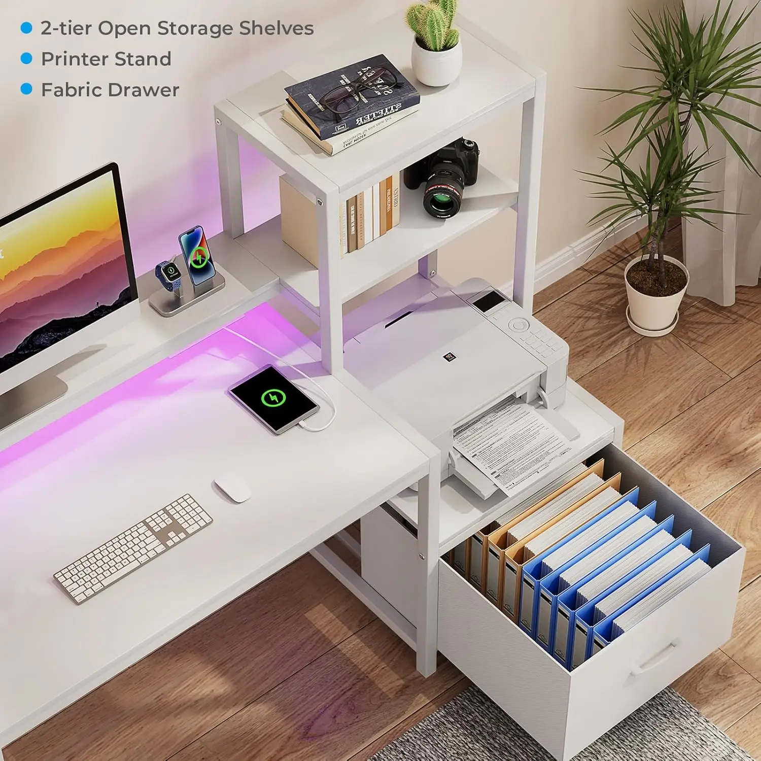 51-Inch White Computer Desk with Drawers, Monitor Stand, LED Lights, and Power Outlets for Home Office or Gaming