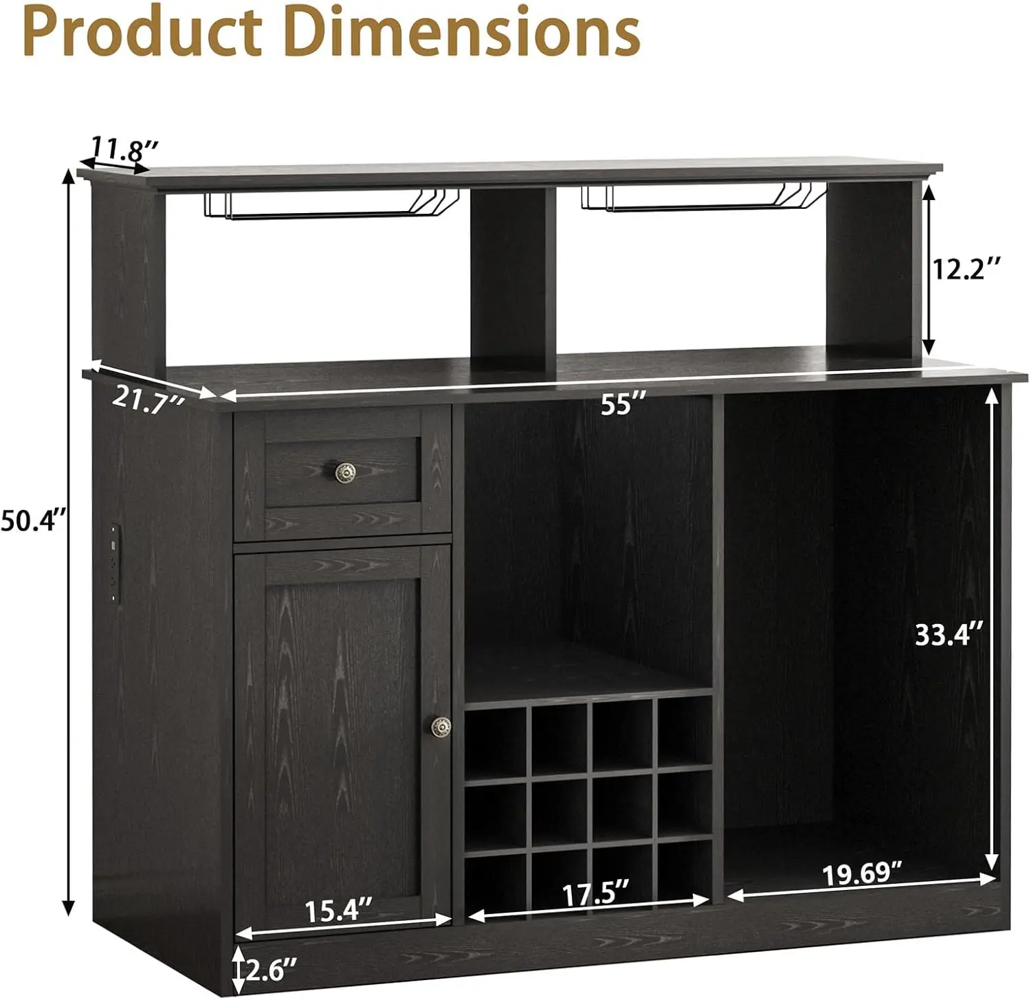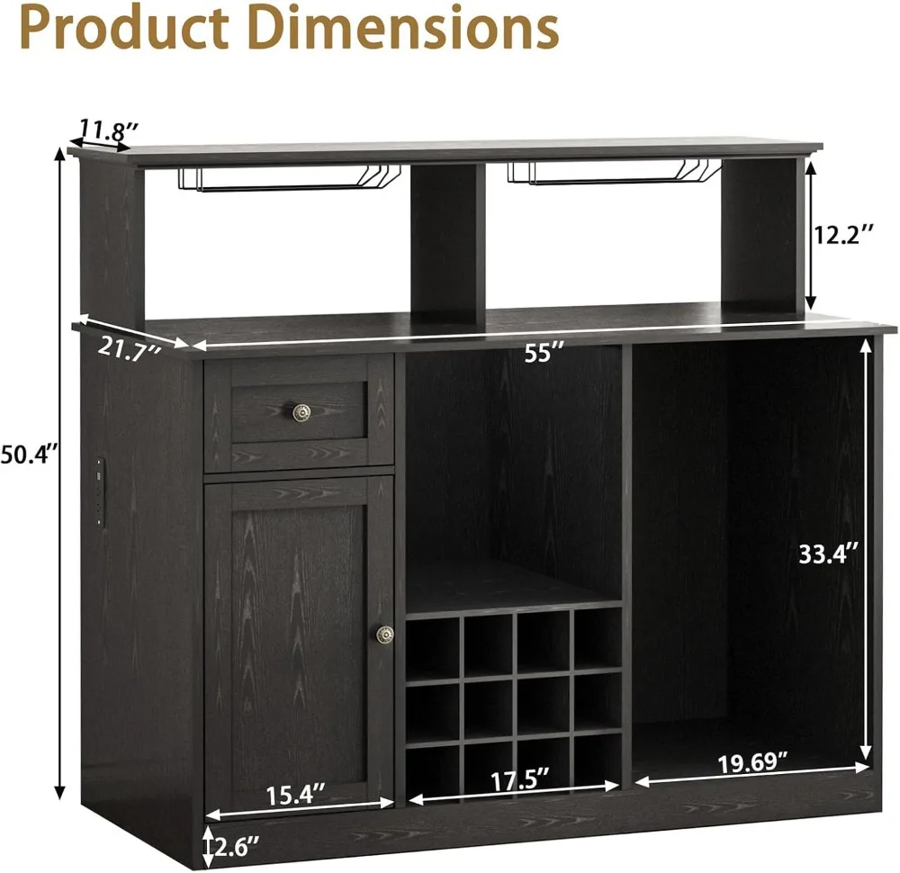 Transform your home with this versatile 55-inch farmhouse-style wine bar cabinet, designed to elevate any living space. Featuring integrated mini fridge space (accommodates fridges up to 20″W x 21″D x 33″H; fridge not included), it’s perfect for storing beverages and snacks within easy reach. The elegant wood grain finish and vintage handles add rustic charm, while the multi-level storage system includes a drawer for quick access, a lower cabinet for hiding clutter, 12 wine racks, and hanging glass holders—ideal as a coffee bar or buffet cabinet. Enhance functionality with built-in LED lights that softly illuminate your glassware or decor, creating an inviting ambiance. The convenient charging station offers outlets and USB ports to power coffee makers, blenders, or charge devices seamlessly. With dimensions of 55″L x 21.7″W x 50.4″H, this piece fits perfectly in kitchens, dining rooms, or living areas. Crafted from sturdy materials with reinforced panels and reliable hardware for long-lasting durability. Assembly is made easy with pre-drilled holes, clearly labeled parts, and step-by-step instructions—just check the manual before starting to ensure all parts are present. Elevate your home decor today!