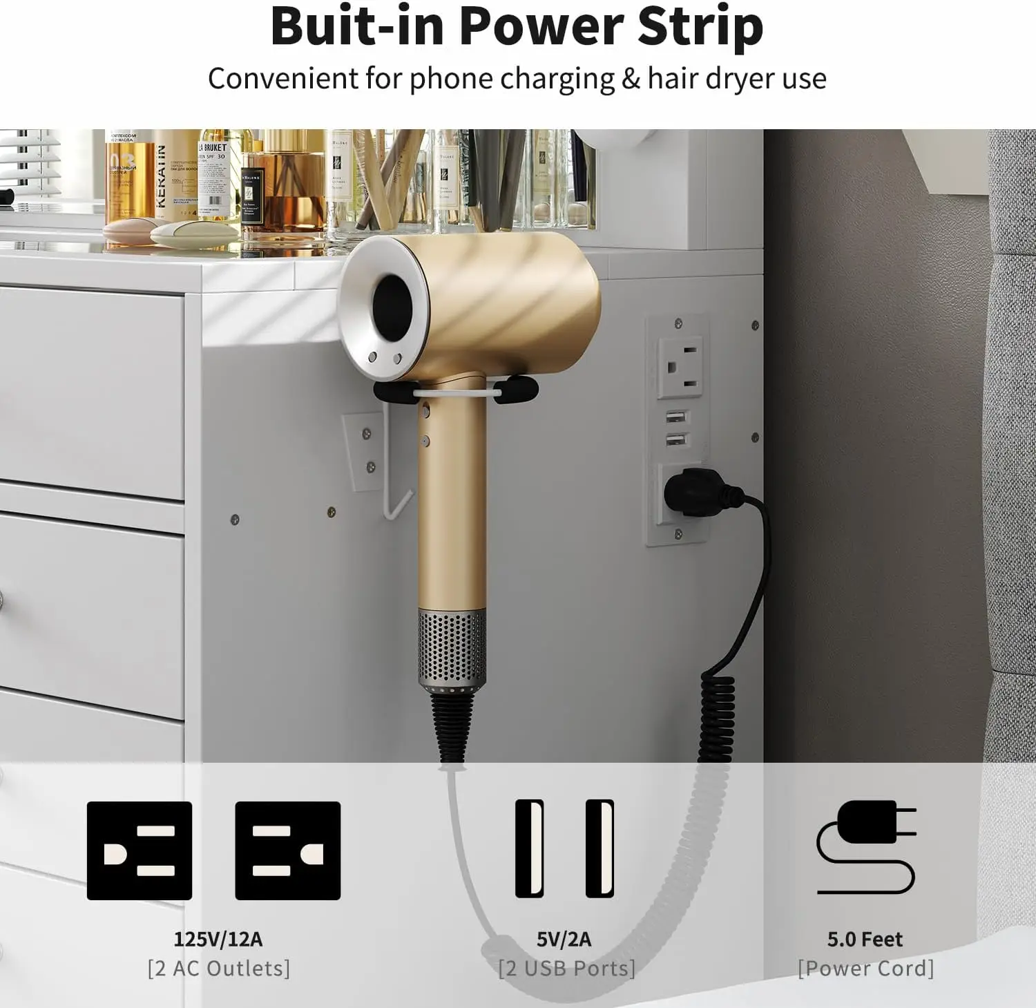 - Vanity Table with Charging Station: Stay connected and powered up with the power outlet, featuring 2 standard plug sockets and 2 USB ports. Perfect for charging your hair dryer, curling iron, phone, tablet, or laptop, this vanity table lets you take stunning selfies or stay productive while you glam up
