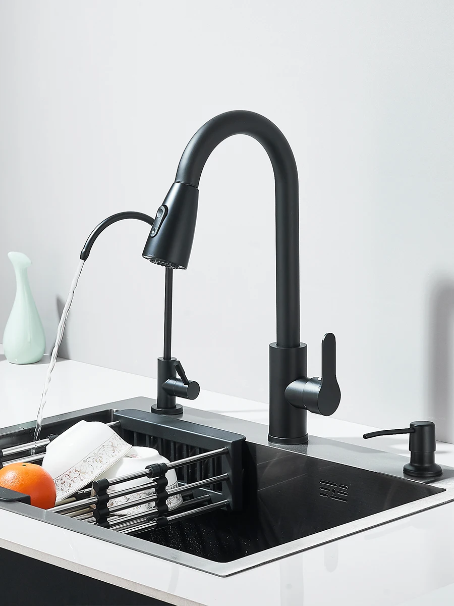 55x45cm Multi-functional Kitchen Sink With Retractable Faucet, Soap Dispenser,Drinking Water Tap Black Stainless Steel Sink