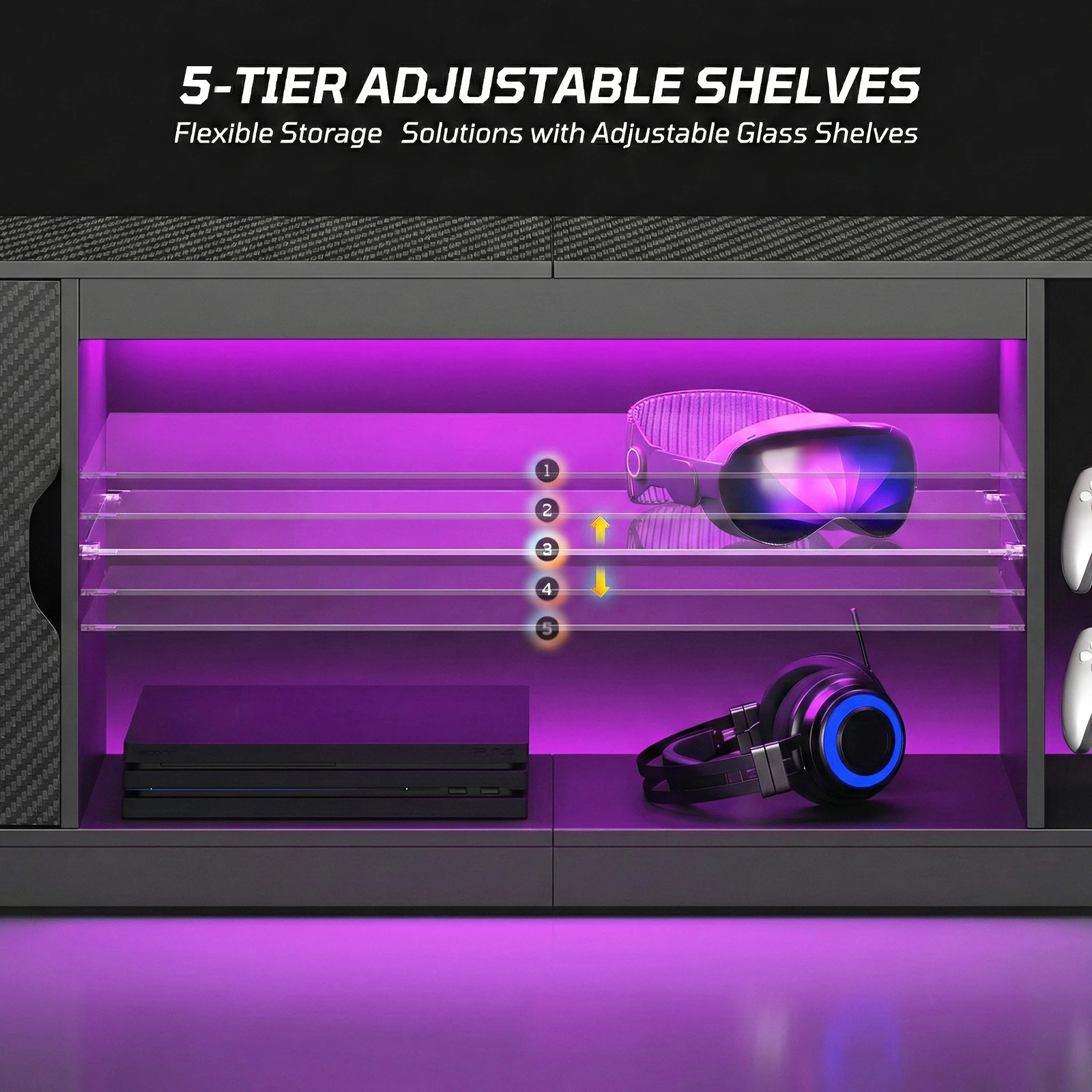 Adjustable Tempered Glass Shelves: Features sturdy, height-adjustable tempered glass shelves that combine elegance with durability. Showcase games, collectibles, or decor while the integrated LEDs illuminate your display, turning your TV stand into a stunning focal point.