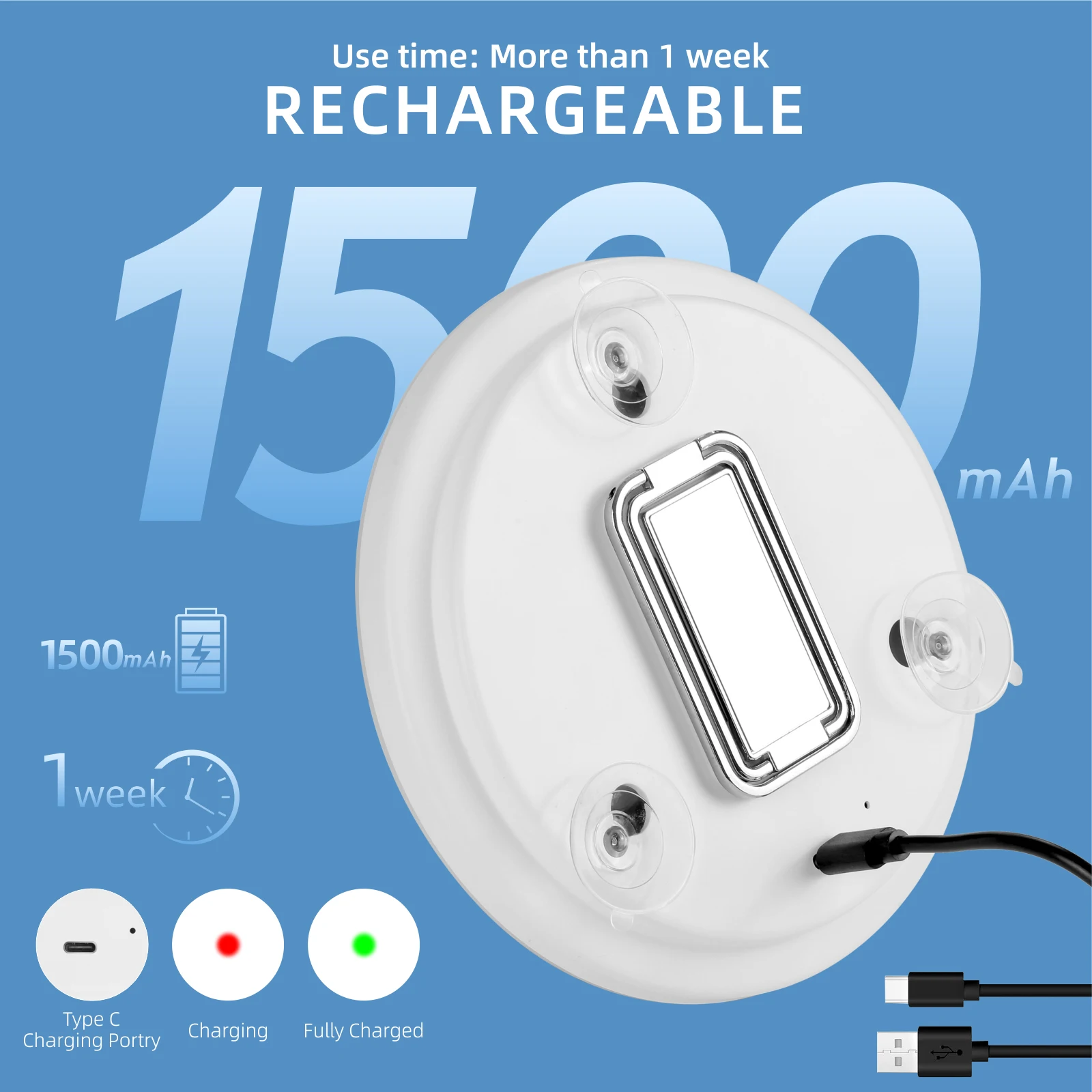 【Compact Mirror with Light】This compact magnifying mirror weighs only 10.4 oz and is 6″ in diameter. Lighted magnifying mirror is built-in 1500mAh rechargeable battery,7 days only need one charge. Classic USB charging ports can be charged for this magnifying mirror through laptop, power bank, charging head.