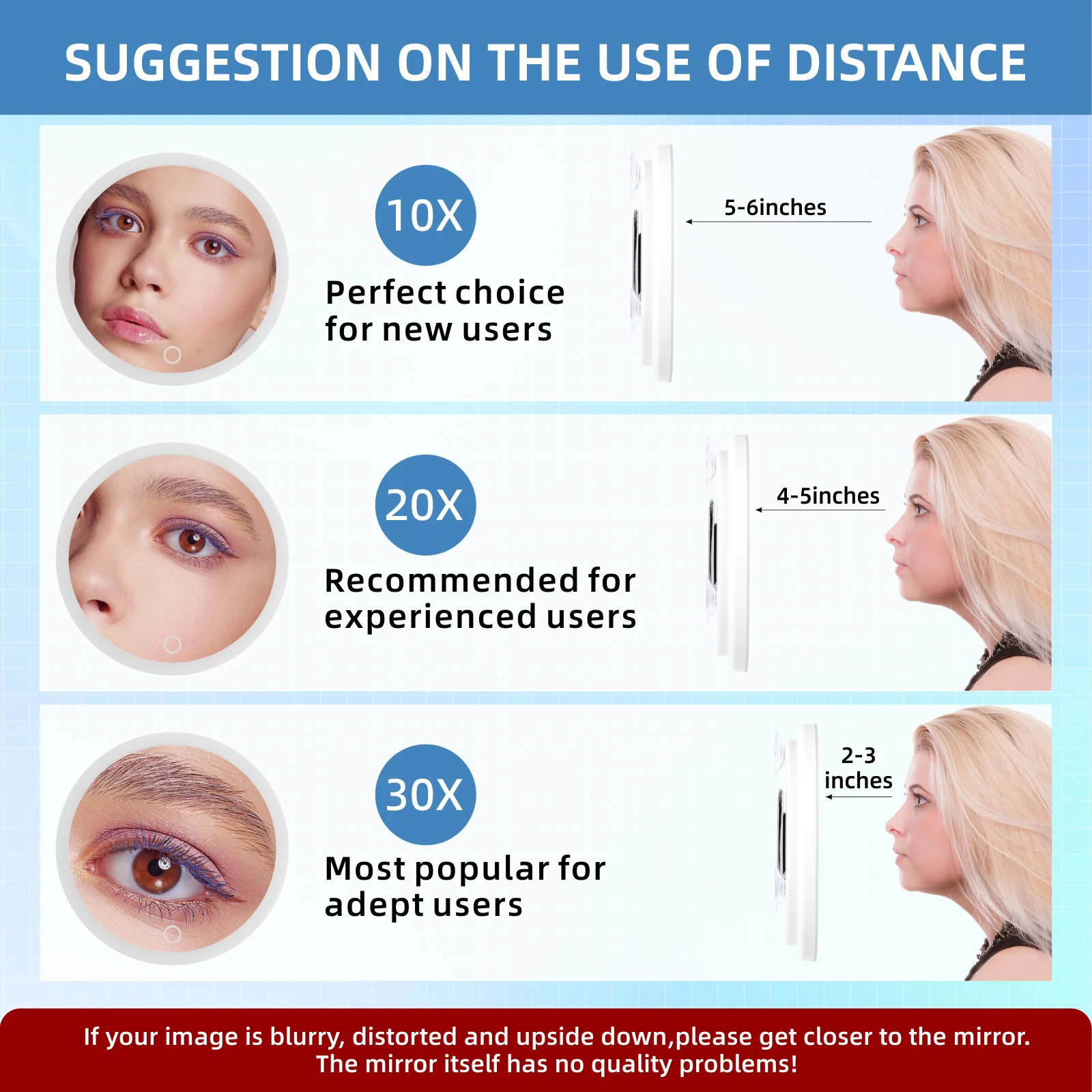 【Helpful Tip】The 5-30X magnification is very powerful and best focus achieved 3-6inches from face. Upside down or distorted image from far away is normal, just move slowly until you get the best focus. This 5-30x magnifying mirror suction cup is perfect gift choice for wife, friends, mother and yourself!
