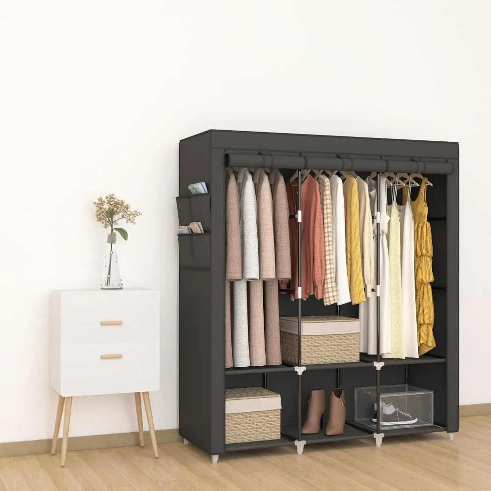 - 𝐑𝐨𝐨𝐦𝐲 𝐖𝐚𝐫𝐝𝐫𝐨𝐛𝐞: This portable closet wardrobe consists of 3 movable hanging rods for clothes, jackets, dresses, coats; 6 storage shelves for folded clothes, bags, hats, accessories, underwear and socks. It will increase space usage of your bedroom.