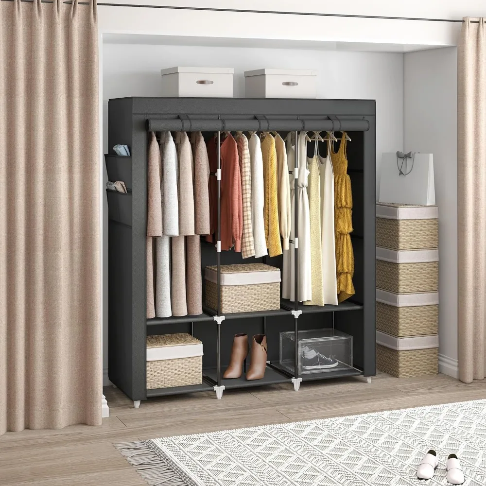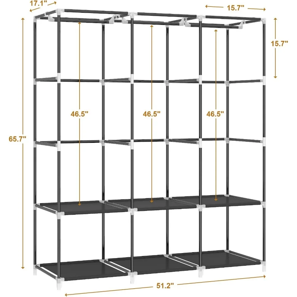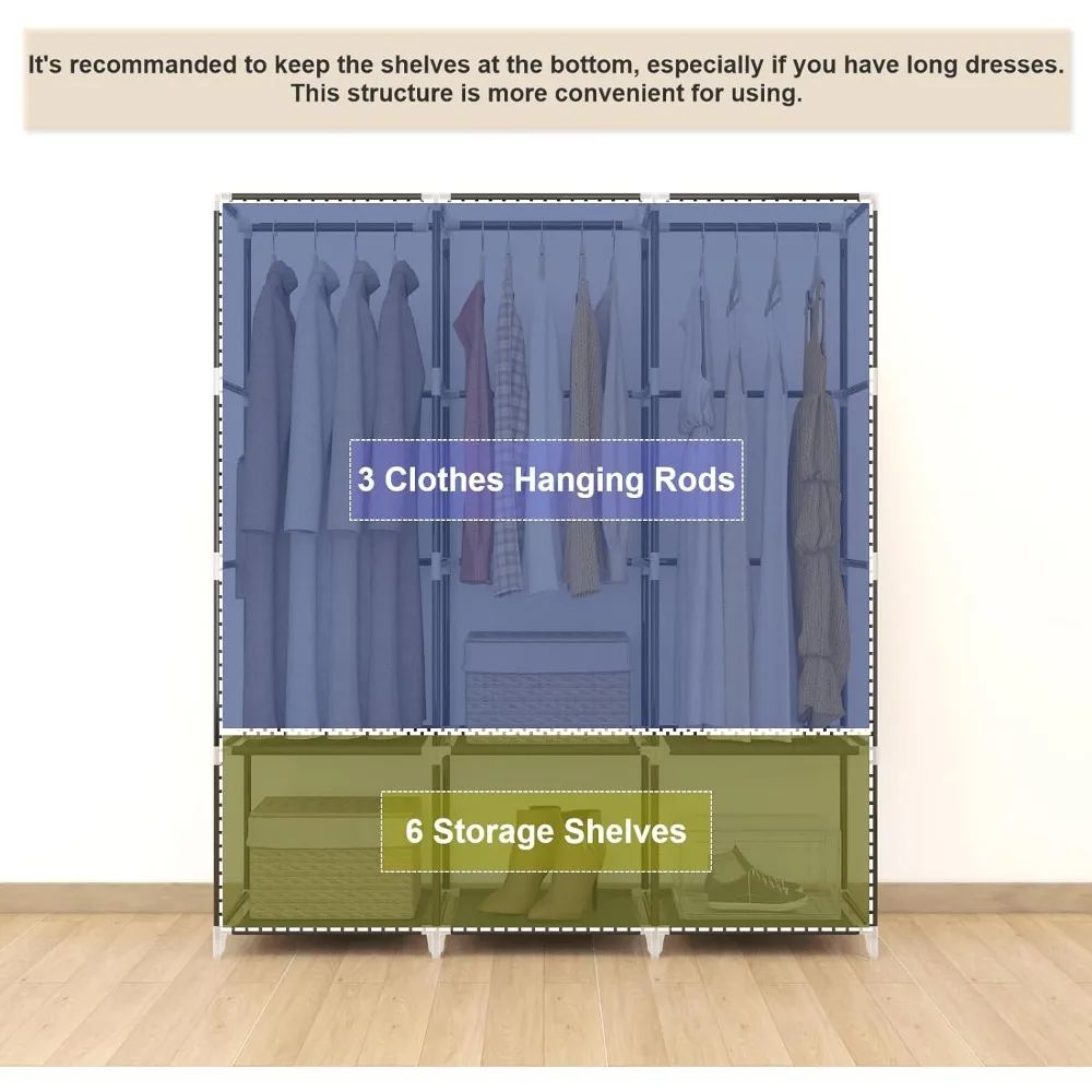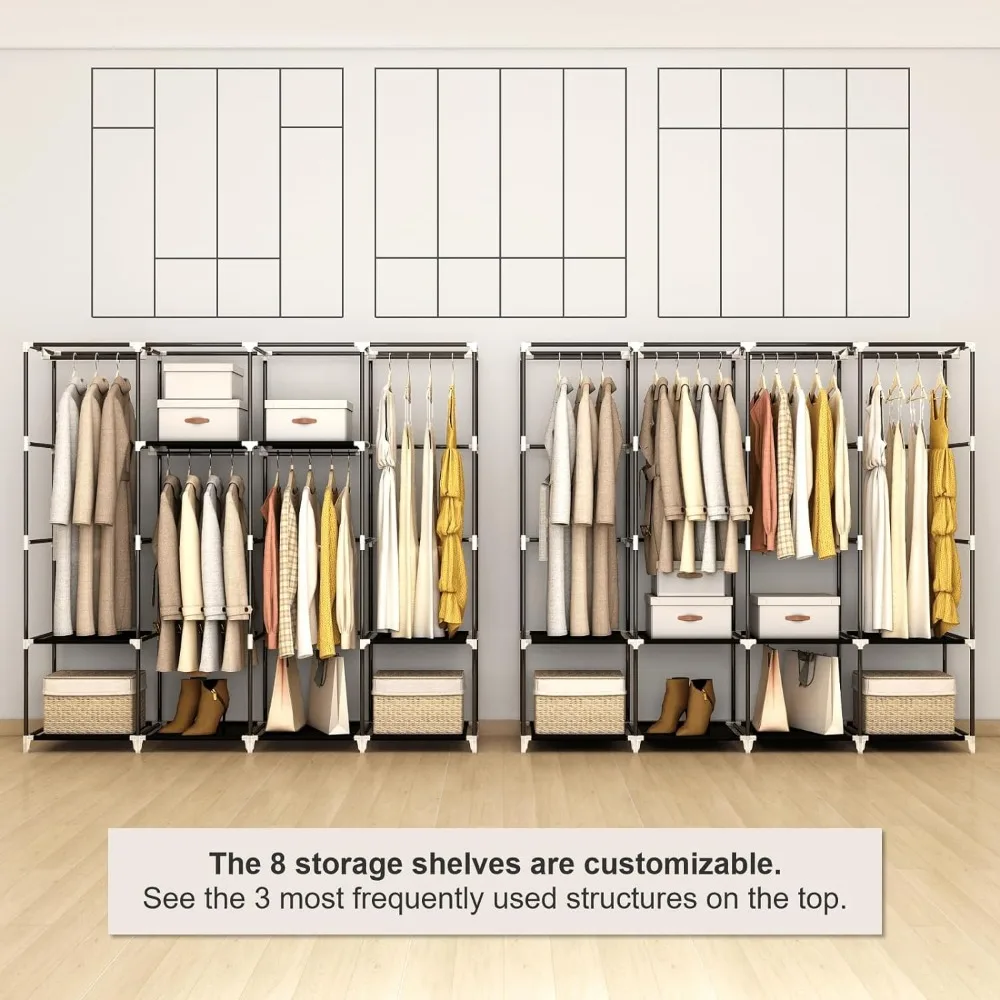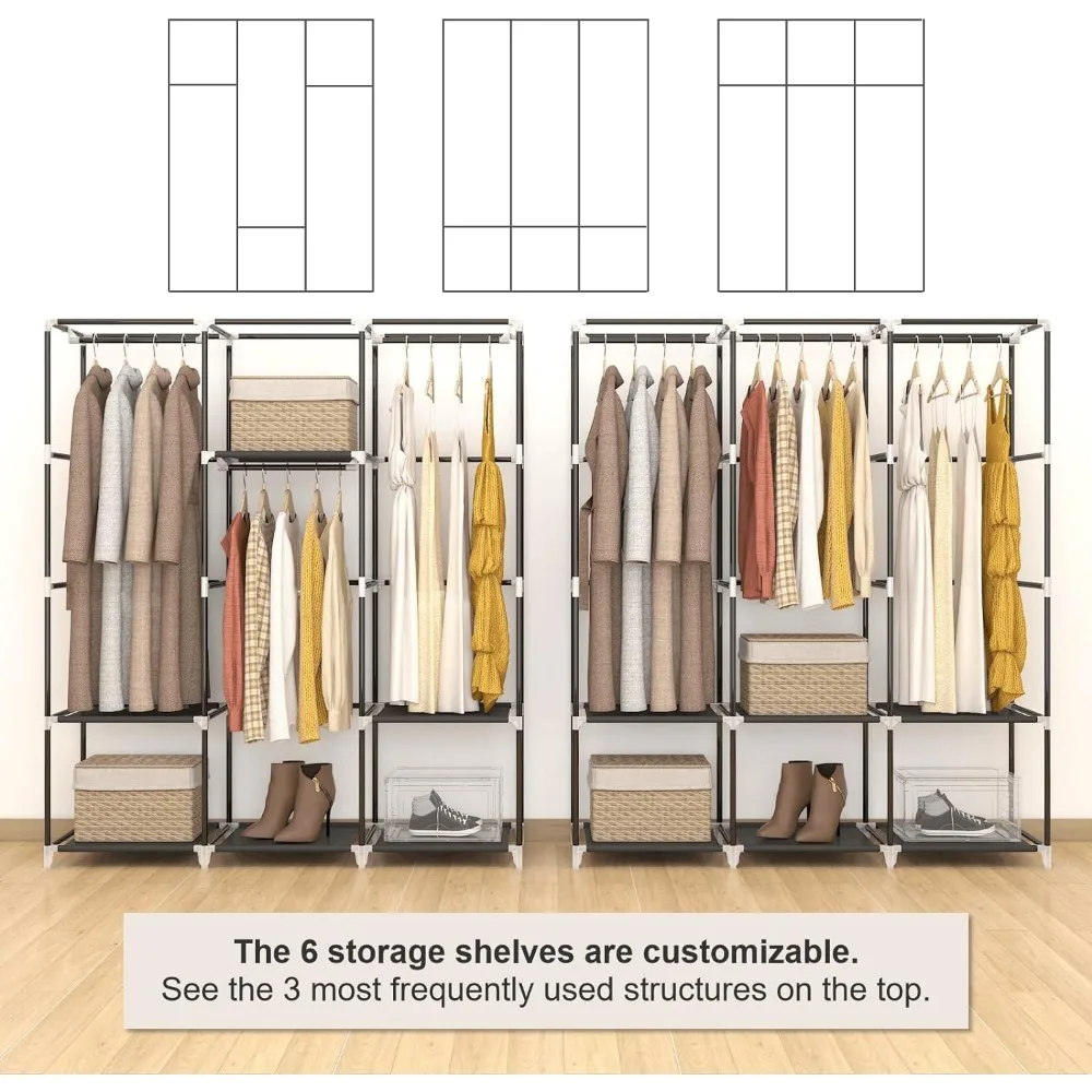 - 𝐑𝐨𝐨𝐦𝐲 𝐖𝐚𝐫𝐝𝐫𝐨𝐛𝐞: This portable closet wardrobe consists of 3 movable hanging rods for clothes, jackets, dresses, coats; 6 storage shelves for folded clothes, bags, hats, accessories, underwear and socks. It will increase space usage of your bedroom.