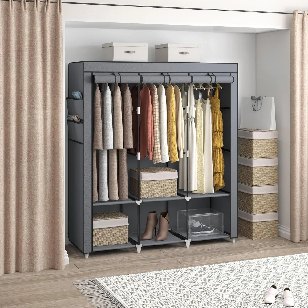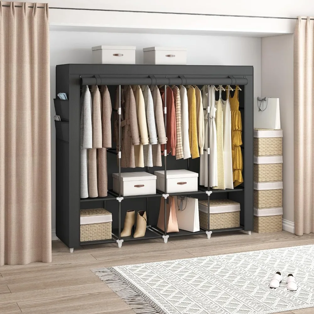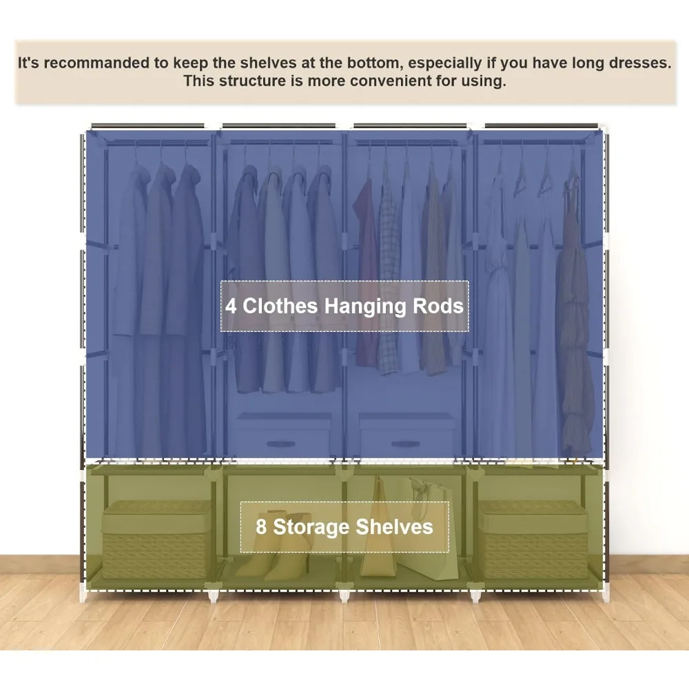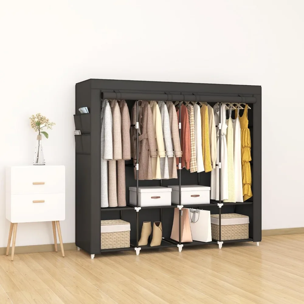 - 𝐑𝐨𝐨𝐦𝐲 𝐖𝐚𝐫𝐝𝐫𝐨𝐛𝐞: This portable closet wardrobe consists of 3 movable hanging rods for clothes, jackets, dresses, coats; 6 storage shelves for folded clothes, bags, hats, accessories, underwear and socks. It will increase space usage of your bedroom.