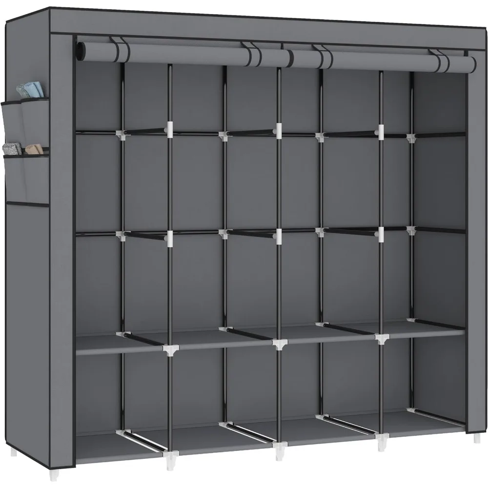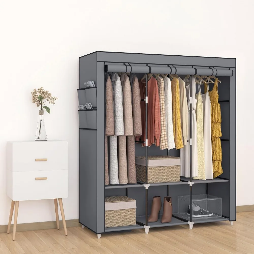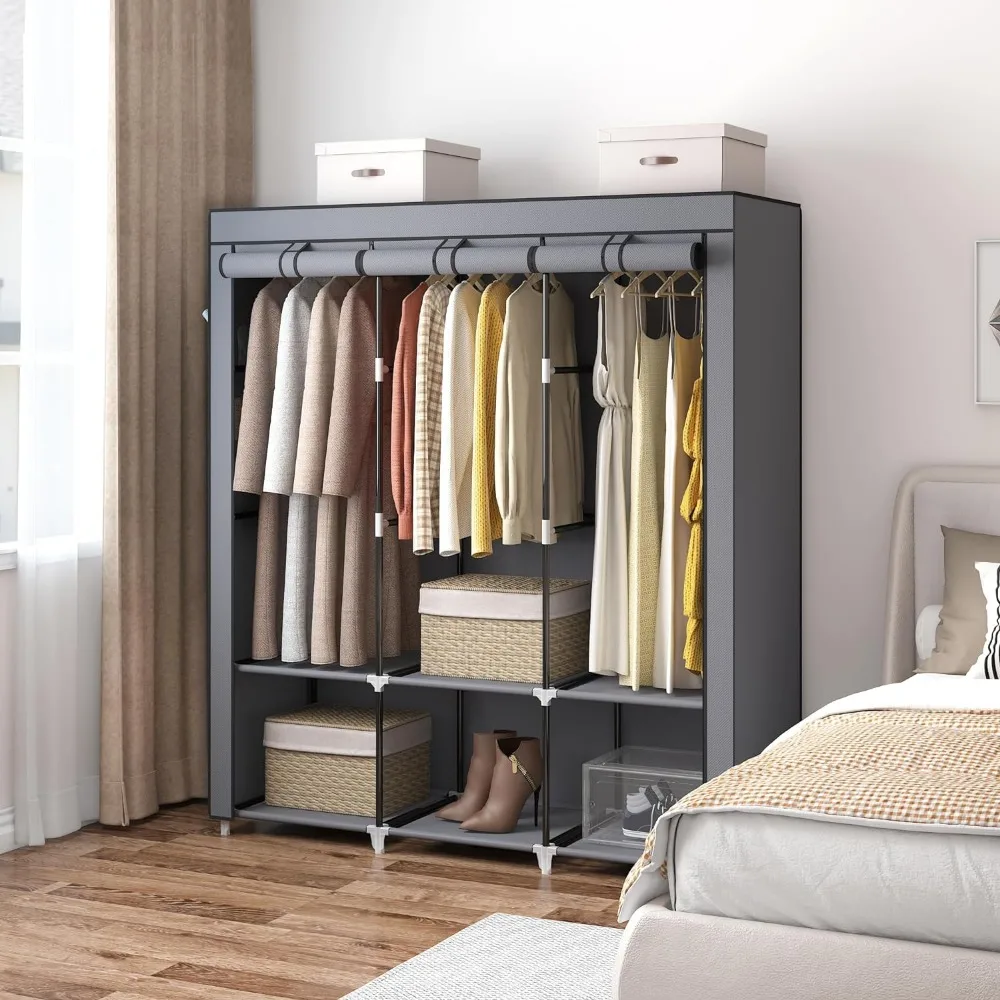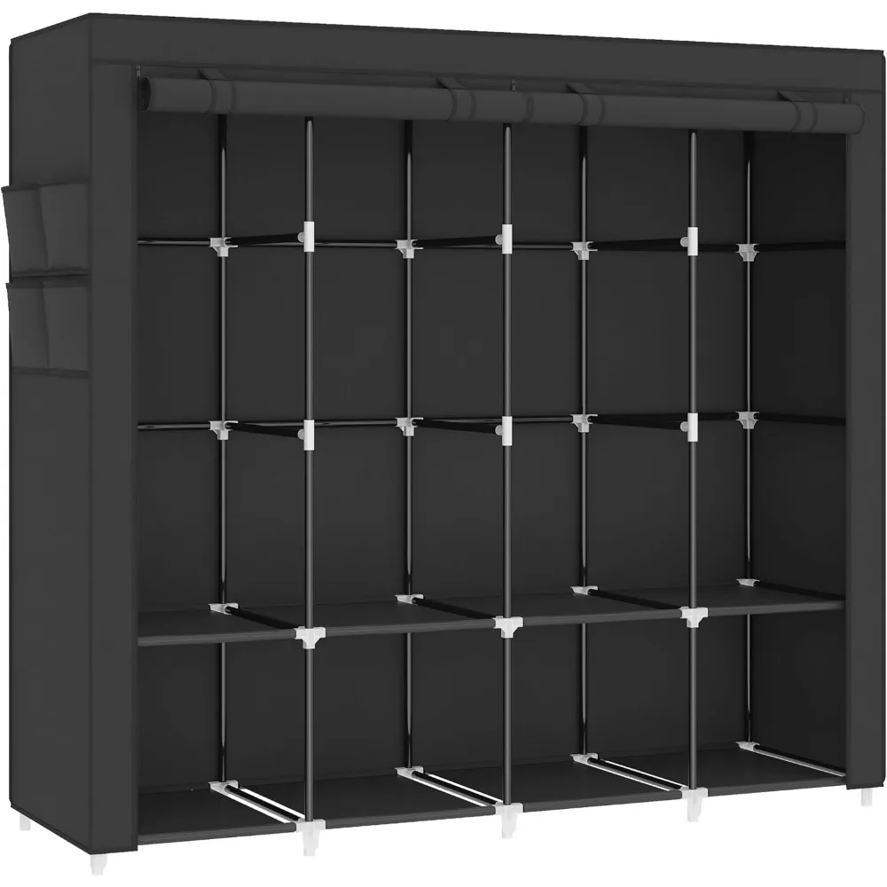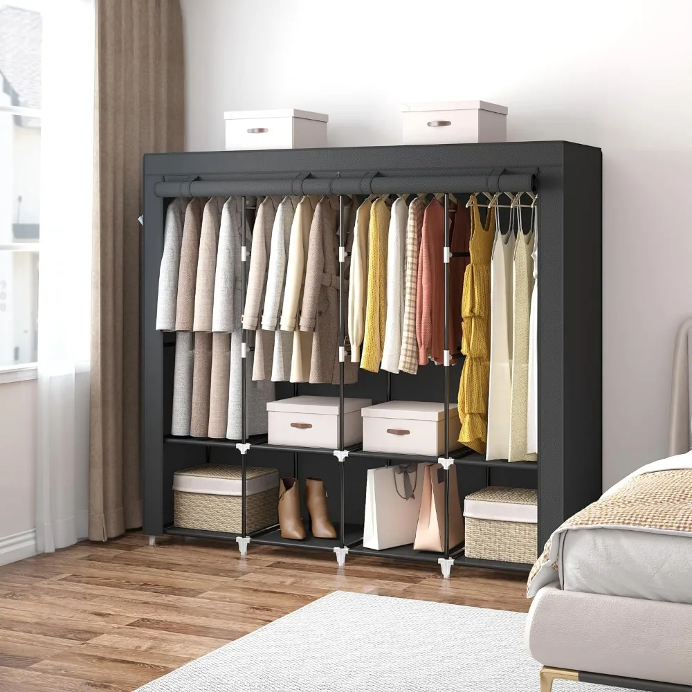 - 𝐑𝐨𝐨𝐦𝐲 𝐖𝐚𝐫𝐝𝐫𝐨𝐛𝐞: This portable closet wardrobe consists of 3 movable hanging rods for clothes, jackets, dresses, coats; 6 storage shelves for folded clothes, bags, hats, accessories, underwear and socks. It will increase space usage of your bedroom.