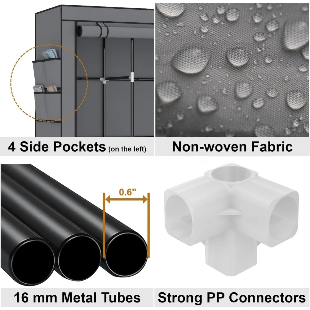 - 𝐒𝐭𝐮𝐫𝐝𝐲 & 𝐃𝐮𝐫𝐚𝐛𝐥𝐞: Our wardrobe features a robust construction, with 0.6″ diameter iron tubes and reinforced PP material connectors. This design guarantees strength and durability, providing secure support for your clothing.