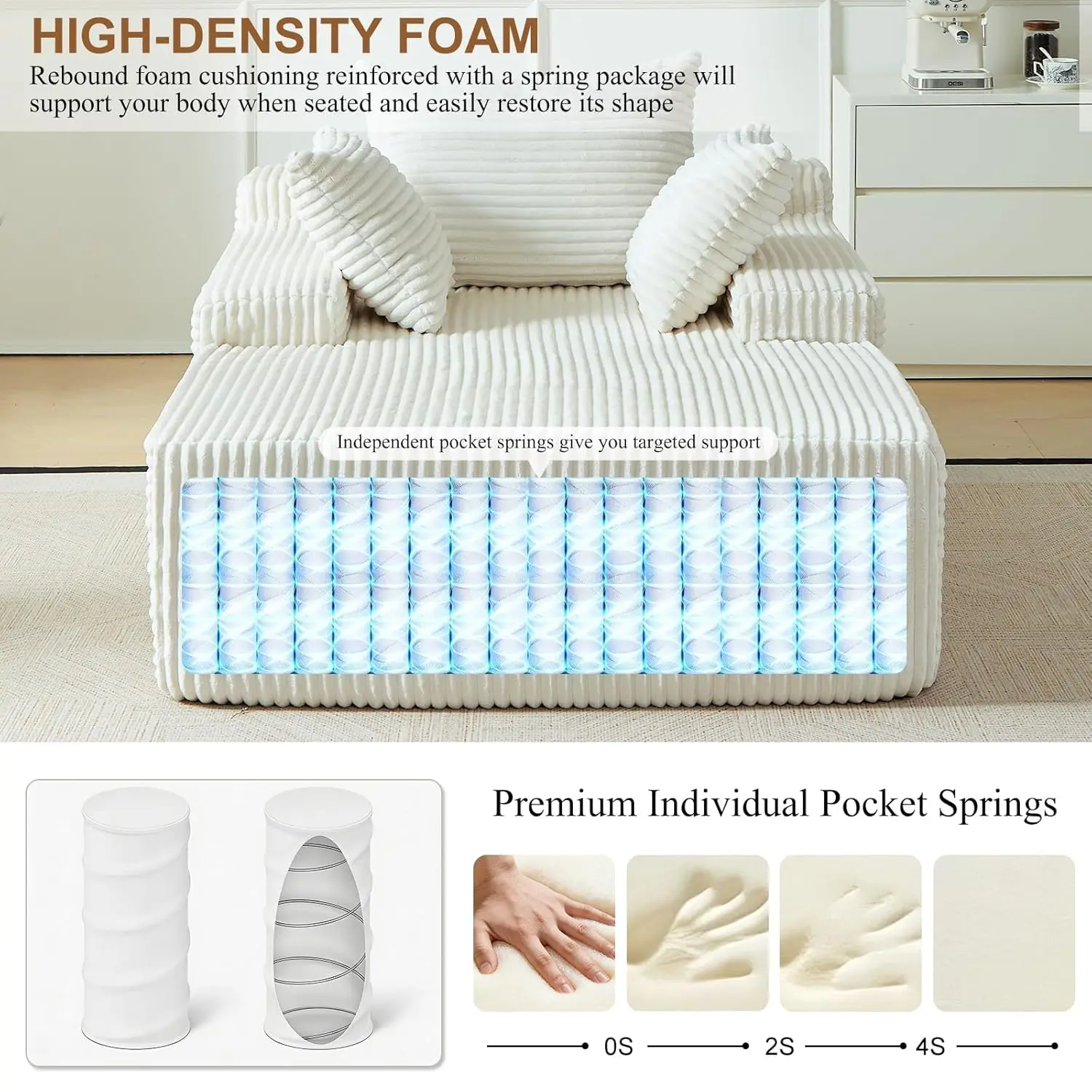 Ultimate Comfort: The seat cushion features embedded high-resilience independent spring assemblies, delivering exceptional comfort and support while maintaining a plush, springy feel. This effectively prevents sagging from prolonged sitting, offering thoughtful protection for your spine and your family’s, so you can enjoy the comfort of being securely supported.