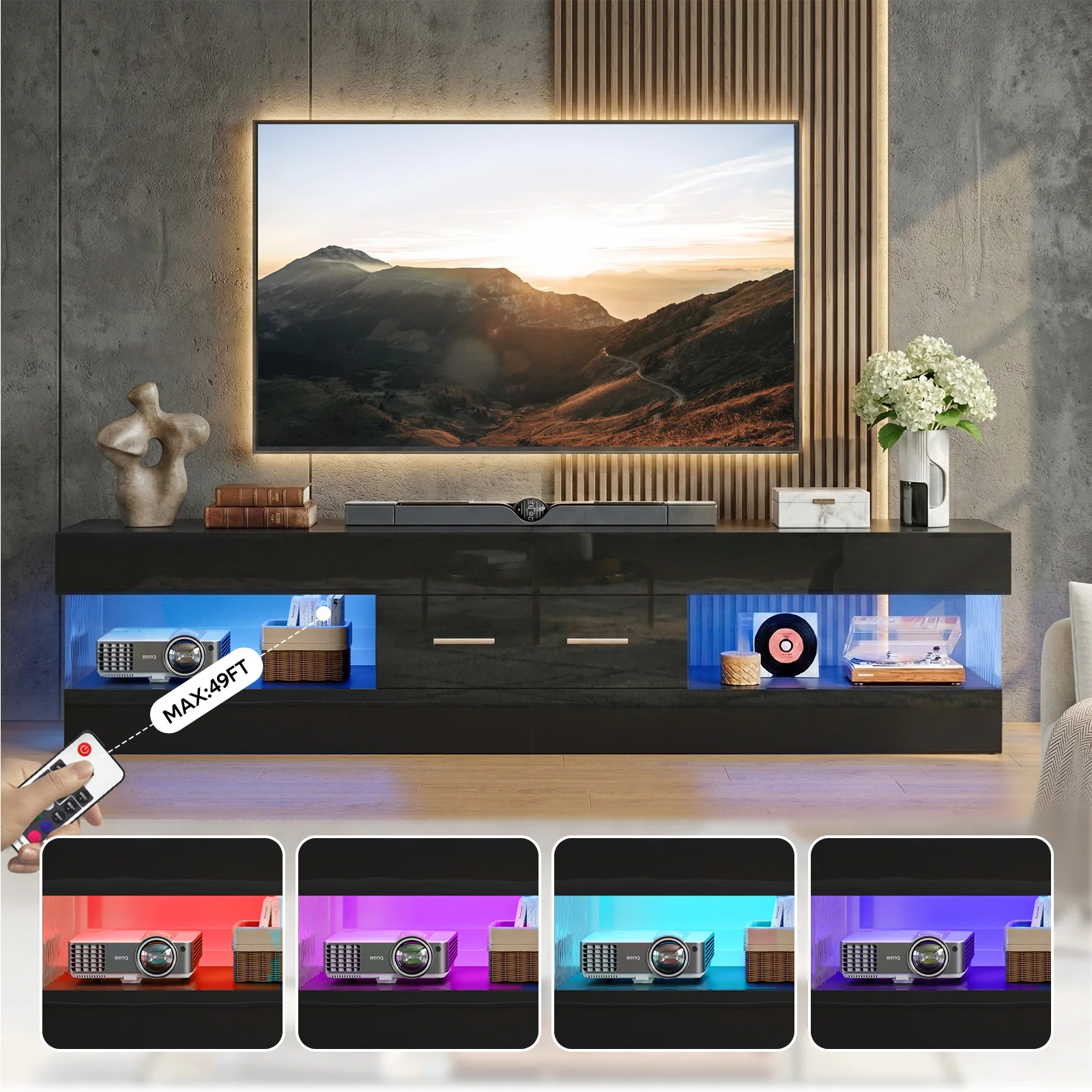 【Modern LED Entertainment Center】This modern tv stand with led lights functions as a refined entertainment center tv stand, featuring 22 dynamic lighting modes that softly glow through stone-patterned doors. The ambient lighting enhances movie nights, gaming sessions, and evening relaxation—adding atmosphere without visual fatigue.