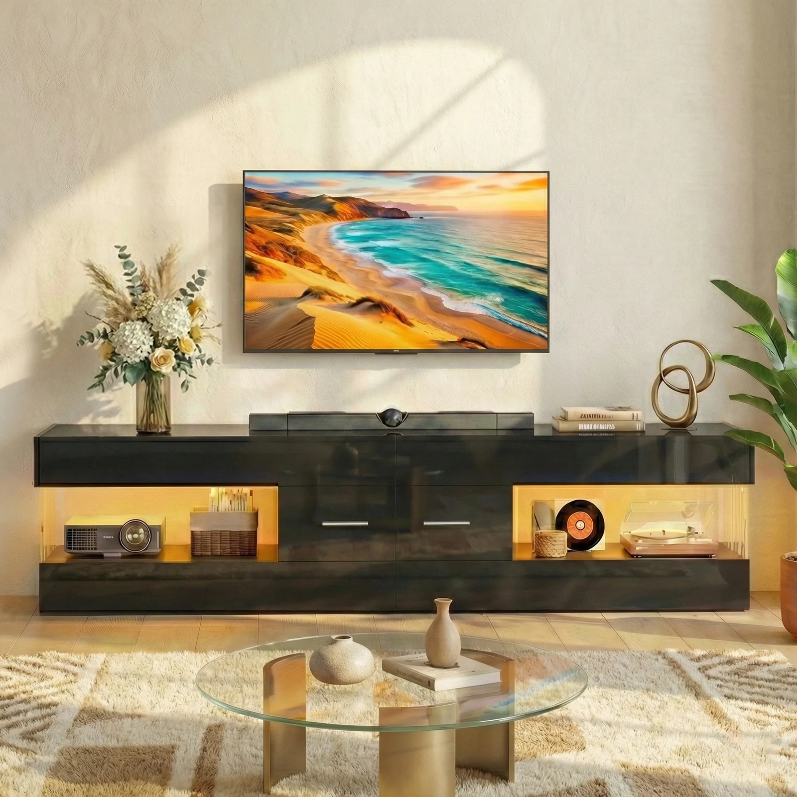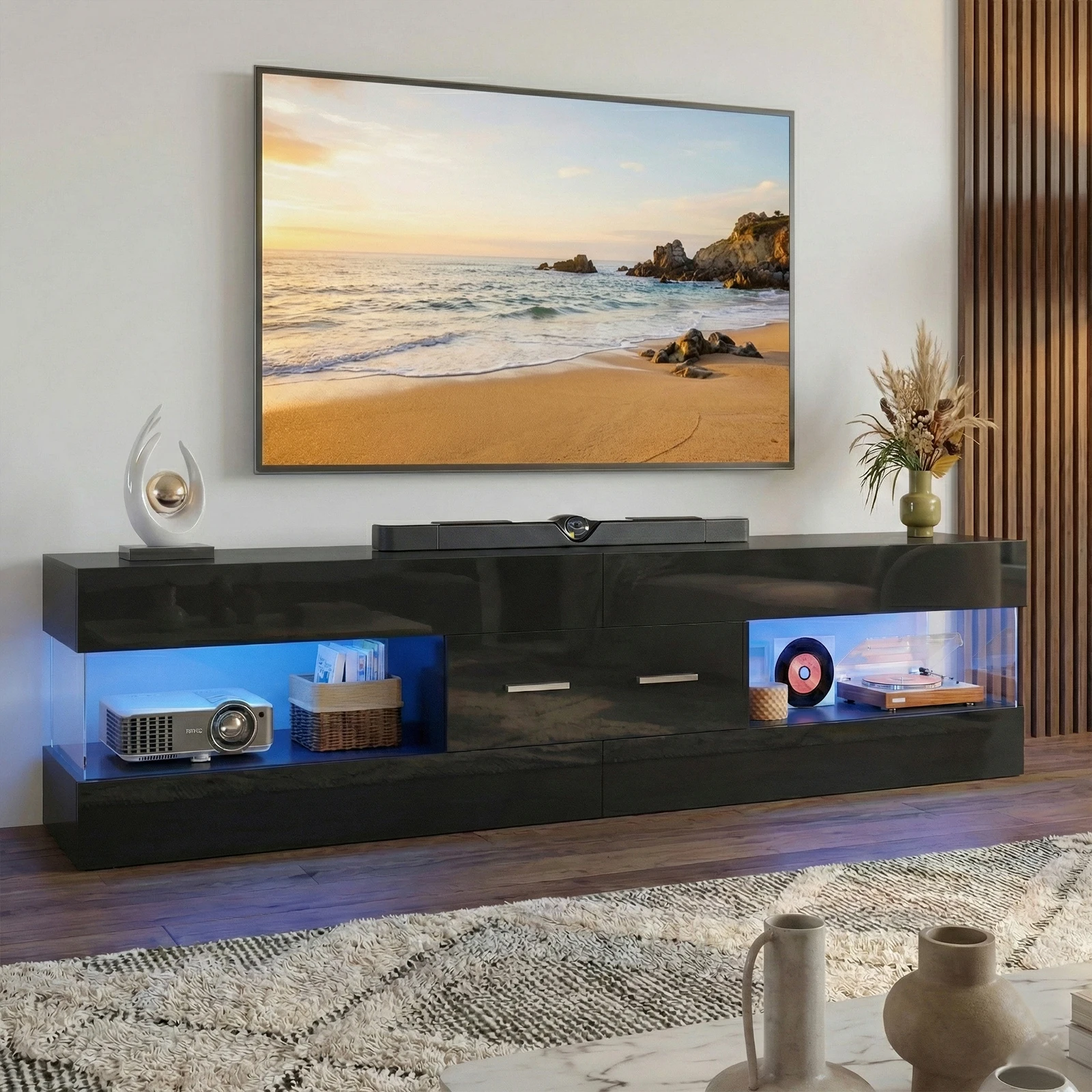 【Refined & Secure High Gloss TV Stand】Elevate your space with this high gloss modern tv stand, featuring a scratch-resistant black glossy finish paired with stone-textured accents for a refined, upscale look. Designed as a stable tv stand for living room or bedroom, it includes dual anti-tipping devices to securely anchor the unit to the wall—adding peace of mind for everyday family use. The raised base helps protect hardwood or carpeted floors from moisture and friction, seamlessly blending modern design with everyday practicality.