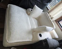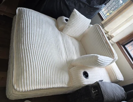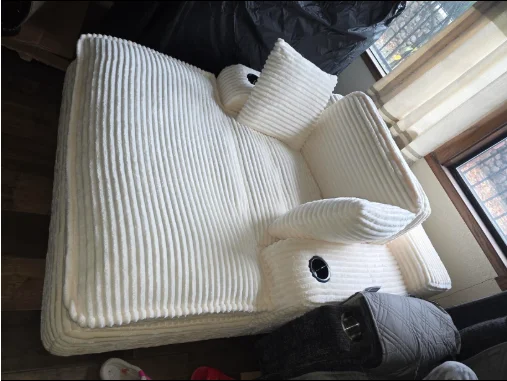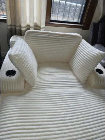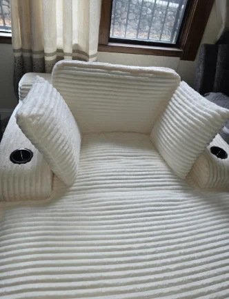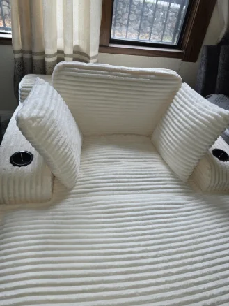 Gorgeous chair, so comfy and easy to clean. There was no assembly required. I love the cup holder. As soon as its assembled, i falled to sleep on it, it came with 3 pillows, 1 big one for the back and 2 for arms rest, so much in love with it, this is the perfect chair for reading or taking nap. The matterial is so soft, the firm of cushion is soft enough to support the back. I like this cream white color, nice and clean.