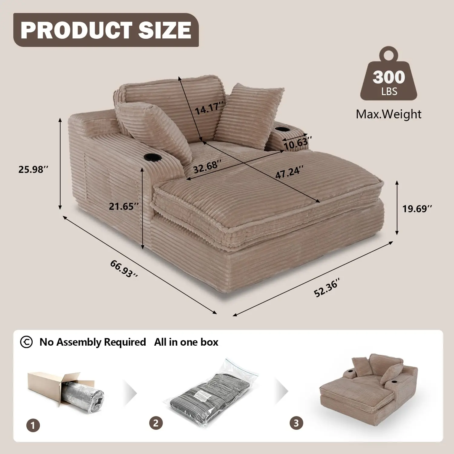 67″ Oversized Chaise Lounge Chair Indoor, Soft Boneless Cloud Couch with 3 Pillows, 4 Side Pockets and 2 Cup, Customized