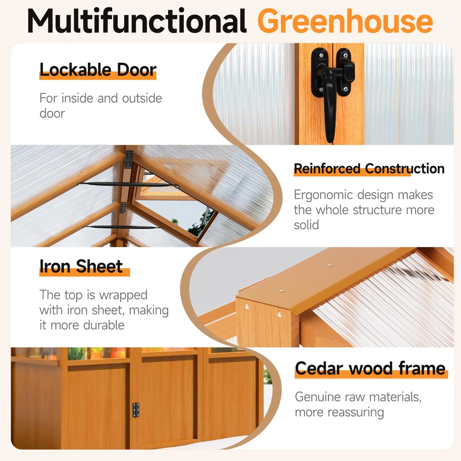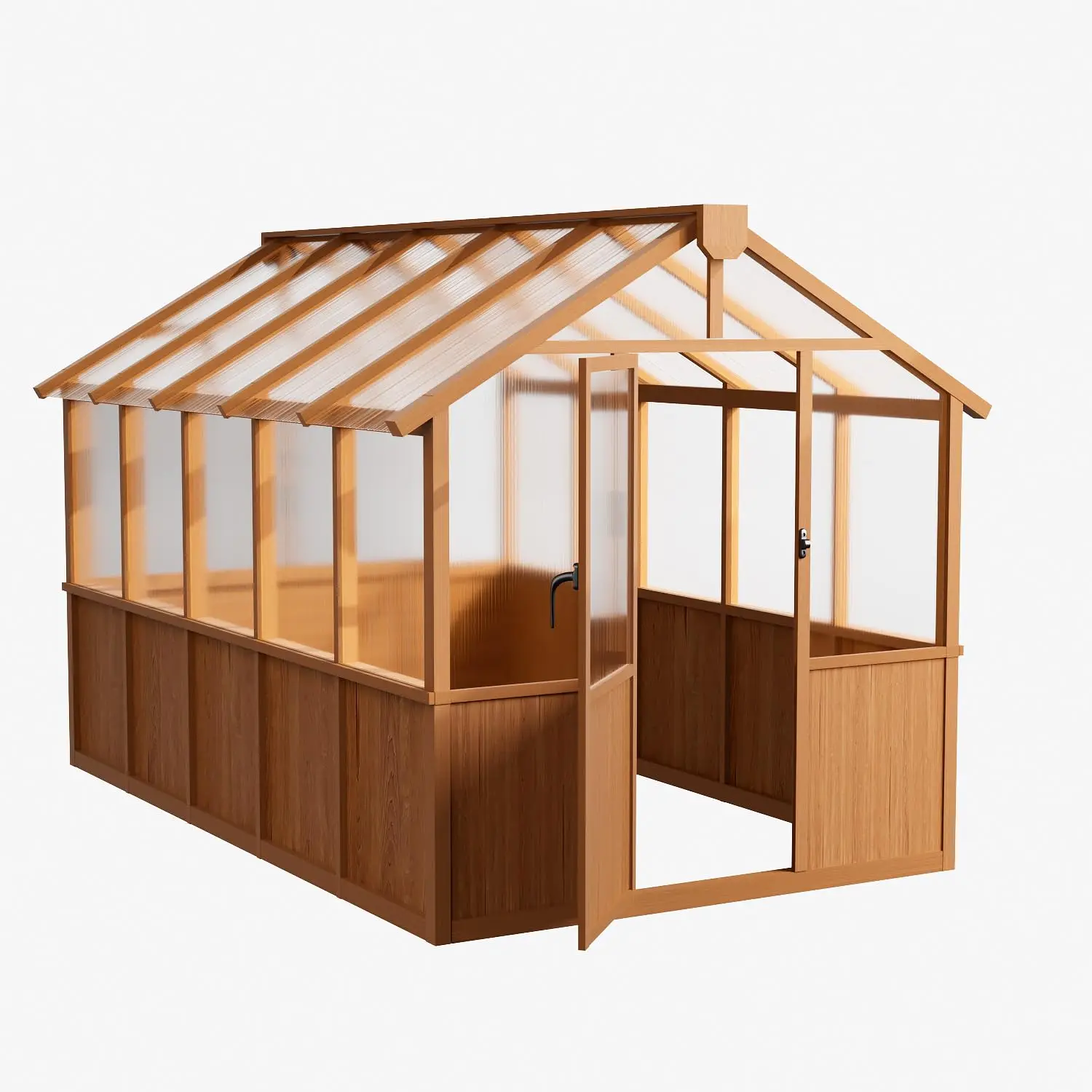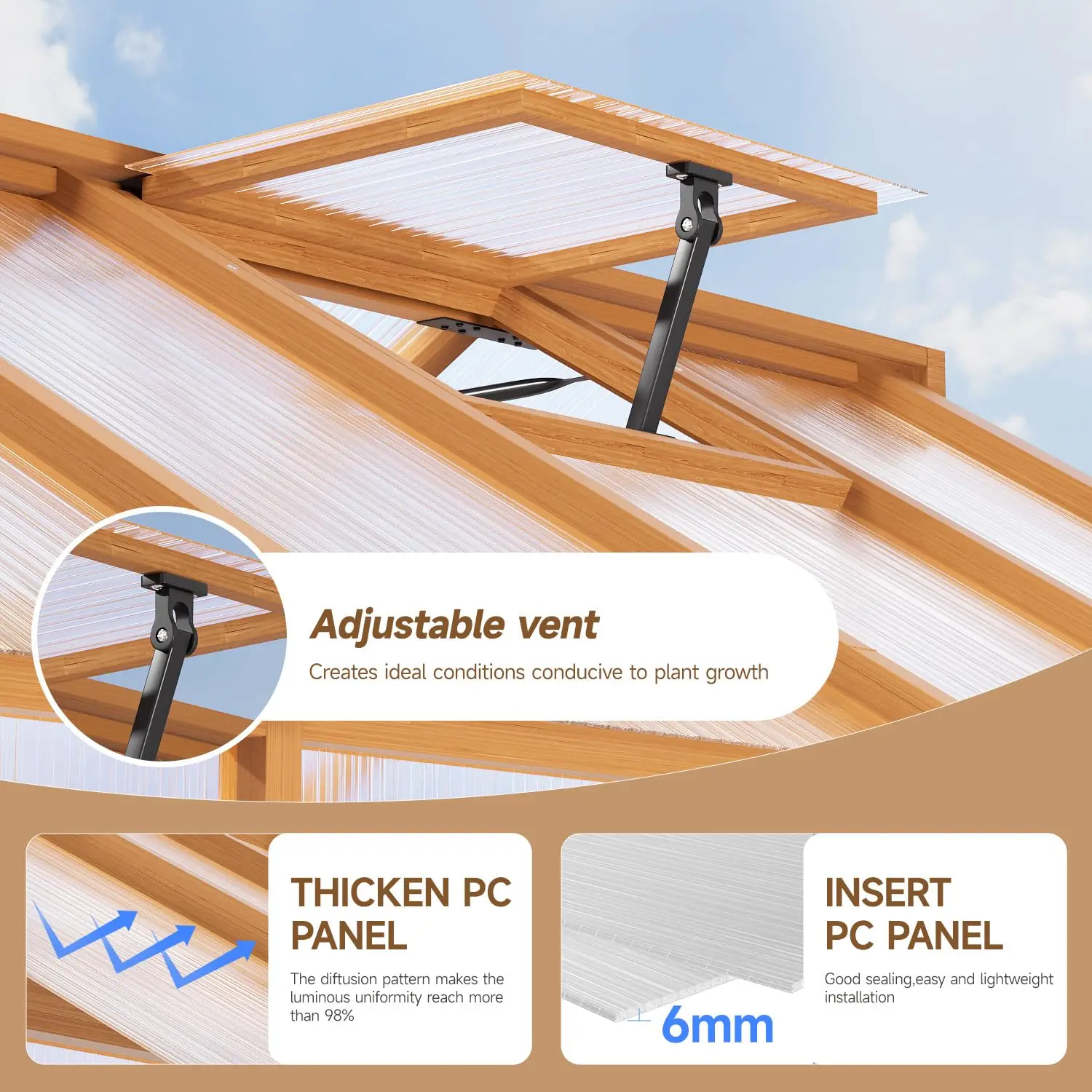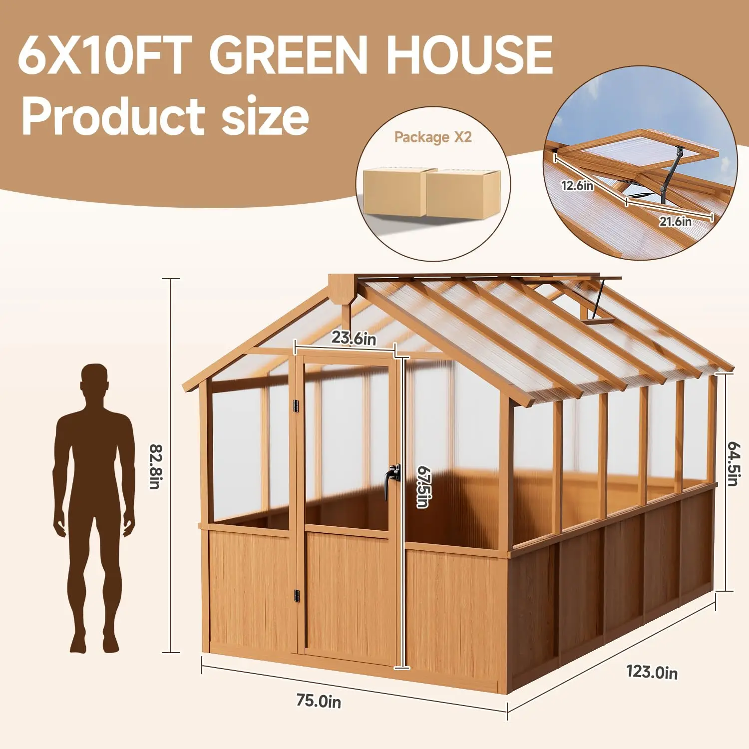 6×10 FT Wooden Greenhouse,Natural Wood Garden House for Plants,Heavy Duty Green House with Polycarbonate Panel,, Customized