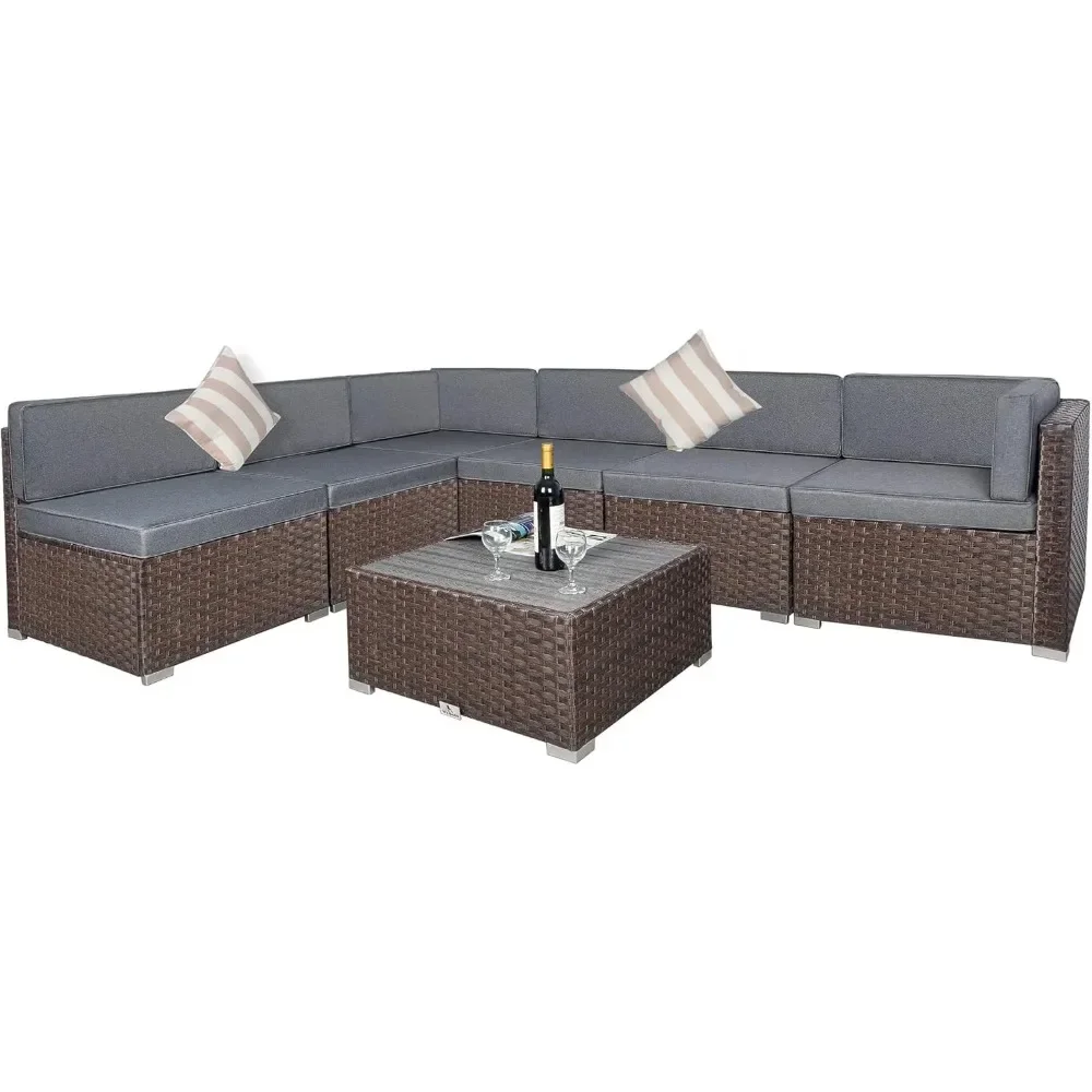 - 【Free Combination】Design your outdoor seating area with a 7-piece PE rattan wicker outdoor conversation set. Includes four armless chairs, two corner chairs, and a chic tea table. Arrange these pieces to suit your outdoor space and preferences.