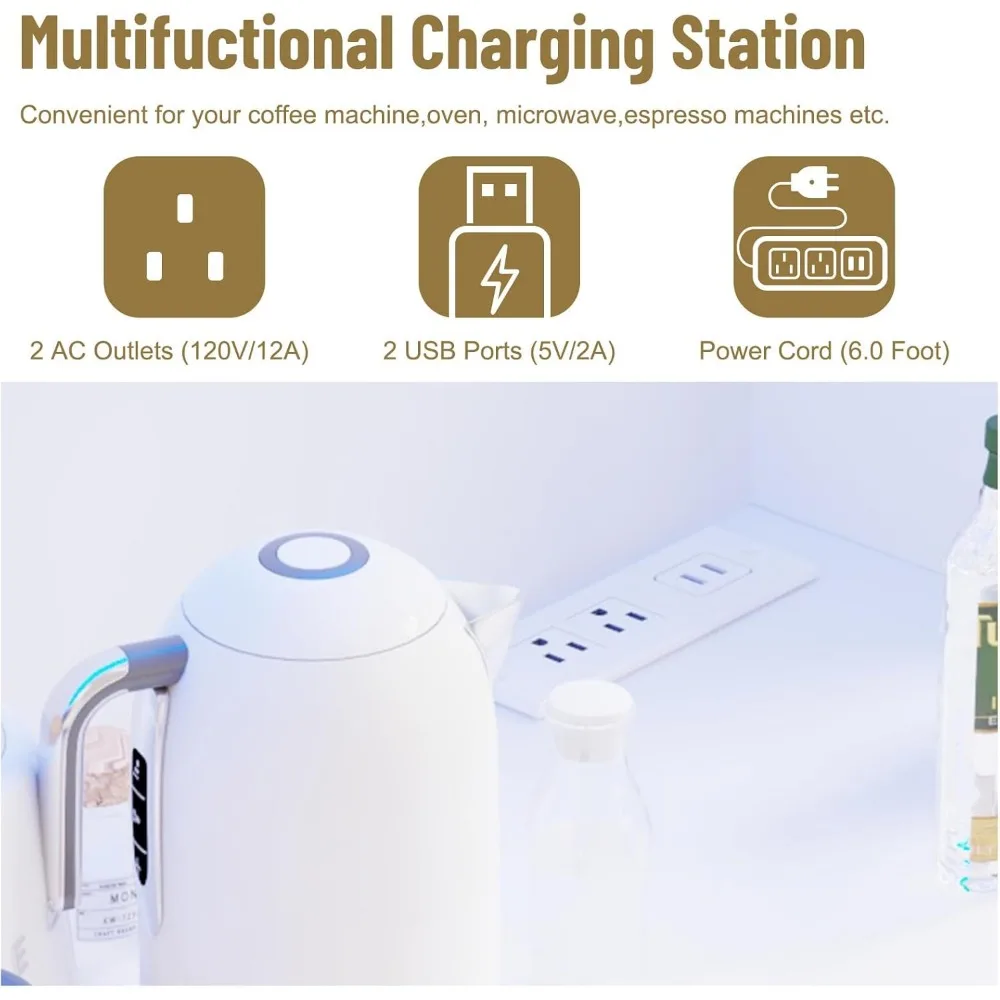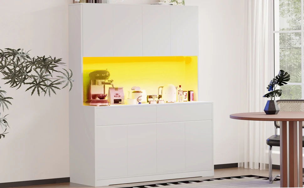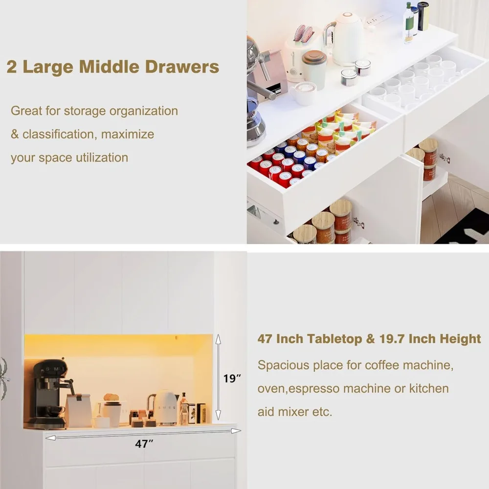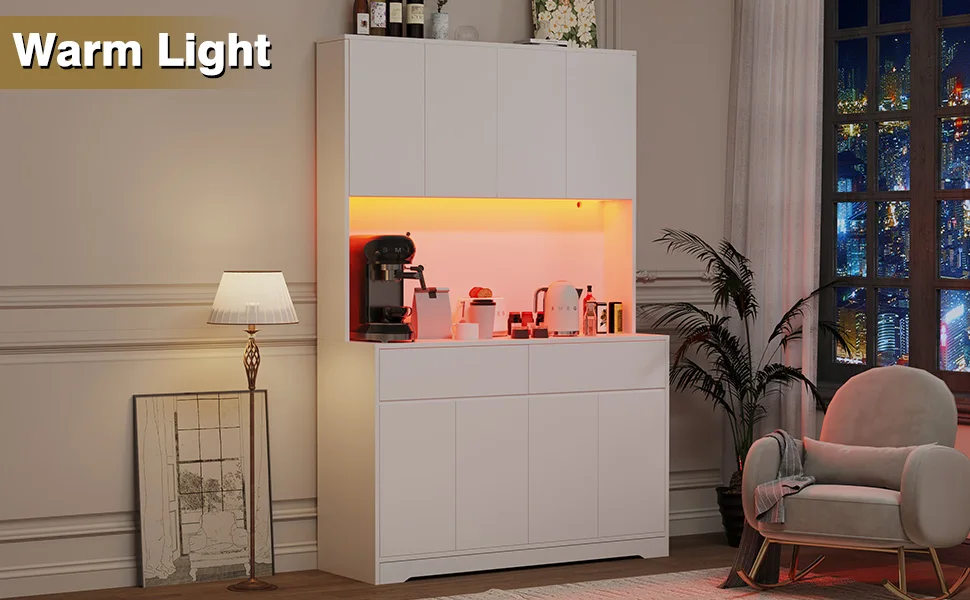 - Pantry Cabinet with Charging Station: The kitchen cabinet with a charging station makes cooking efficient and convenient. our pantry cabinet come with 2 standard AC outlets and 2 USB ports, your daily household appliances such as a microwave and coffee machine can have quick power connection, and LED lights make your cabinet more unique,functional for your daily workflow.