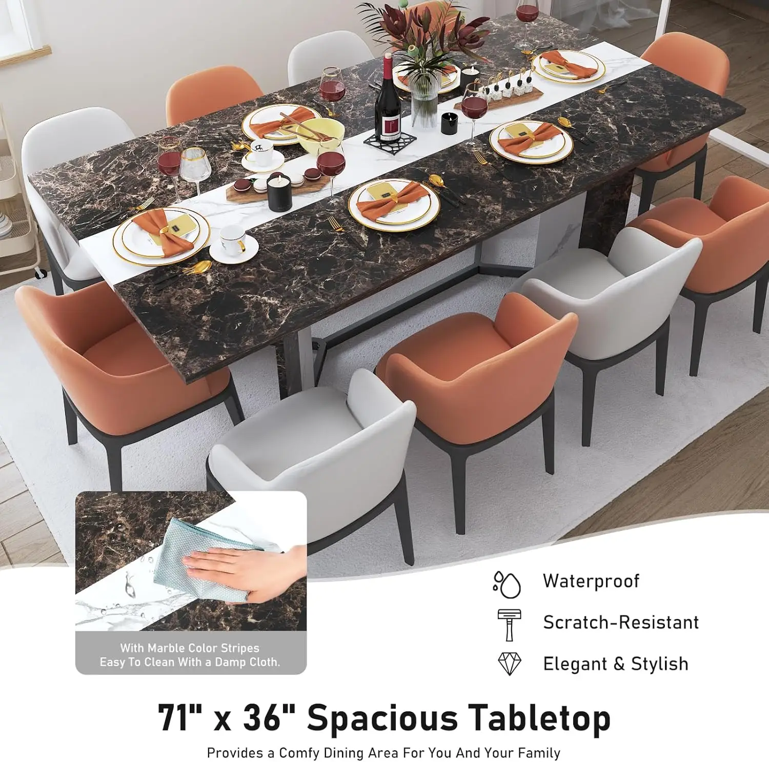 - 🎄🎄【𝐋𝐮𝐱𝐮𝐫𝐢𝐨𝐮𝐬 𝐃𝐞𝐬𝐤𝐭𝐨𝐩 𝐃𝐞𝐬𝐢𝐠𝐧】: The rectangular desktop and marble texture provide a two-tone design that further integrates minimalist style with clean modern lines. Through special craftsmanship, wooden countertops perfectly imitate the charm of marble, adding visual charm to your dining table, making meal time wonderful and making your kitchen more inviting! Desktop is waterproof, scratch-proof and easy to clean.