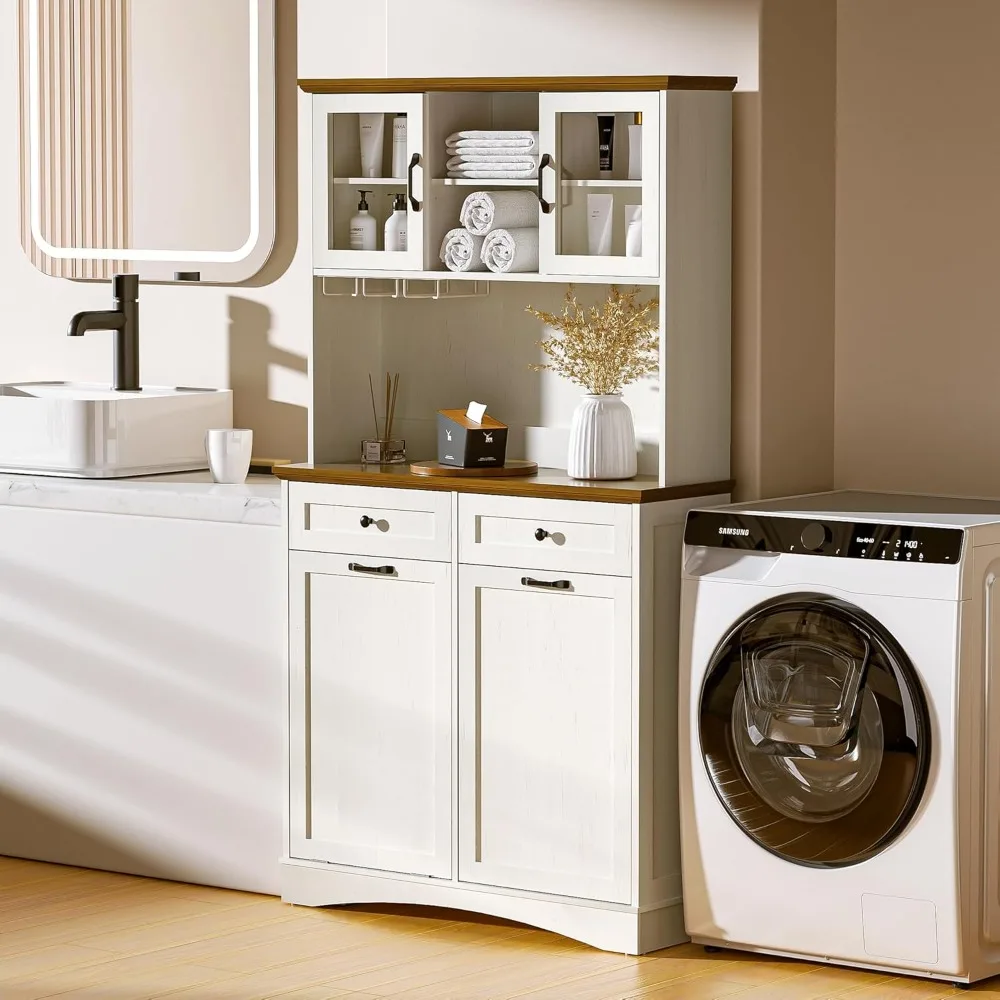 - 【Durable and Stable】Spurgehom Trash Can Cabinet is designed and constructed with rust-resistant hinges/knobs, quality drawer slides, and laundry baskets. Note: Fits plastic trash cans 13 gallons or less.