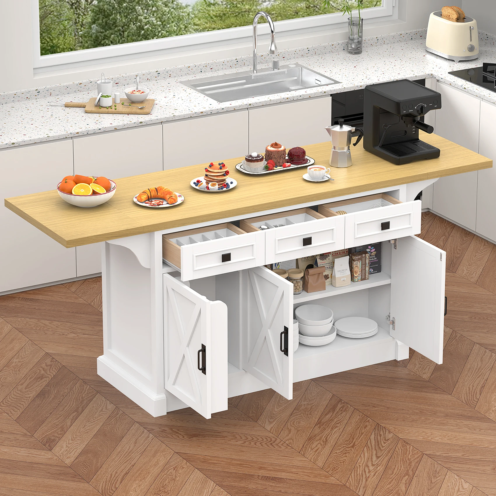The drop leaf feature allows for additional counter space when needed, perfect for gatherings.