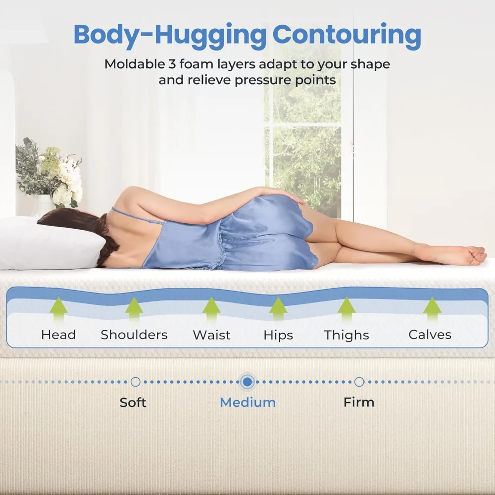 Body-Conforming Comfort: This foam mattress adopts a plush memory foam layer that fills gaps around your body, cradles pressure points like shoulders and hips, and promotes better spinal alignment. Passed the 100,000-cycle rolling test and 30,000-time hip simulation static pressure test, it offers a medium-firm feel
