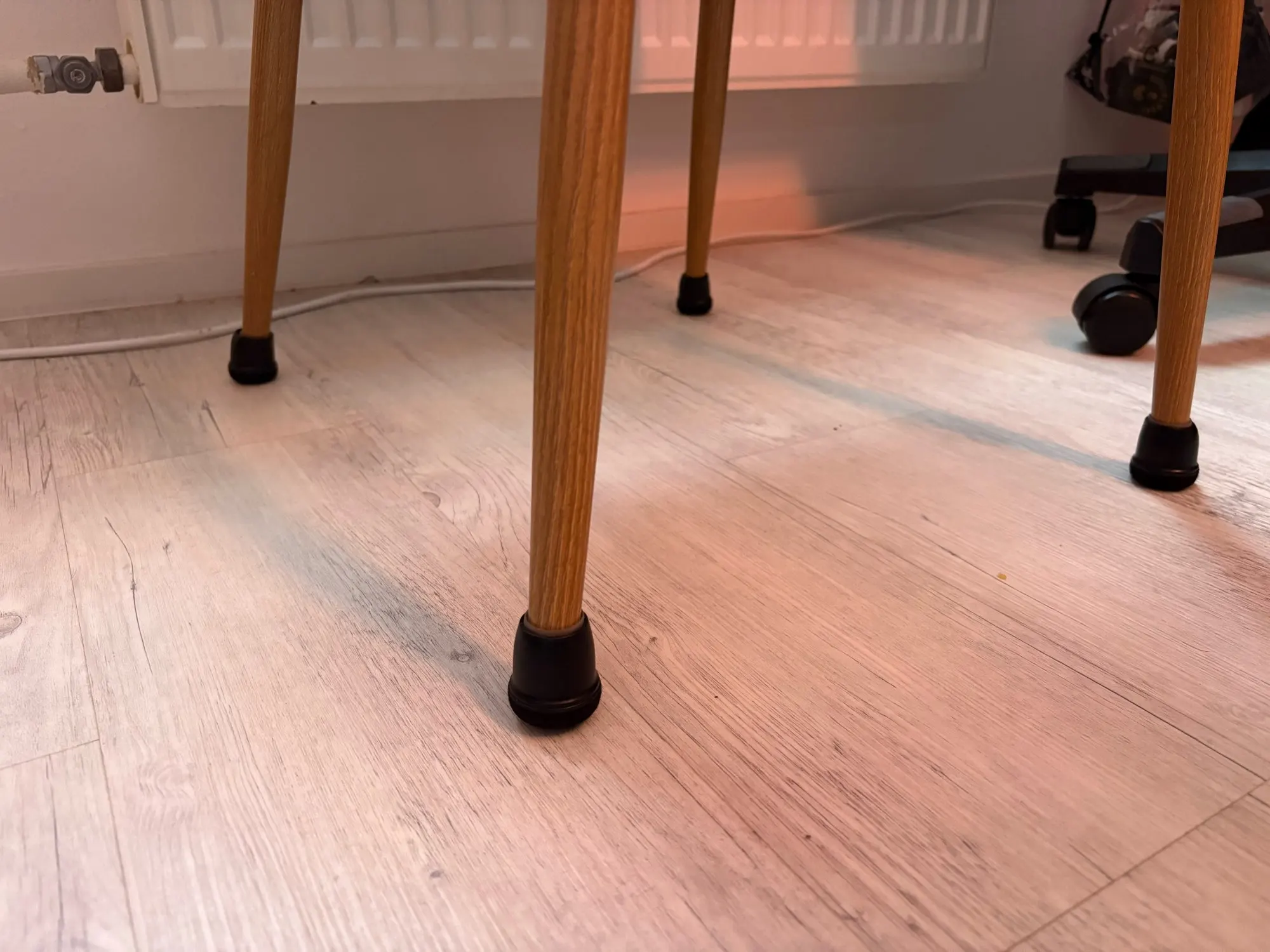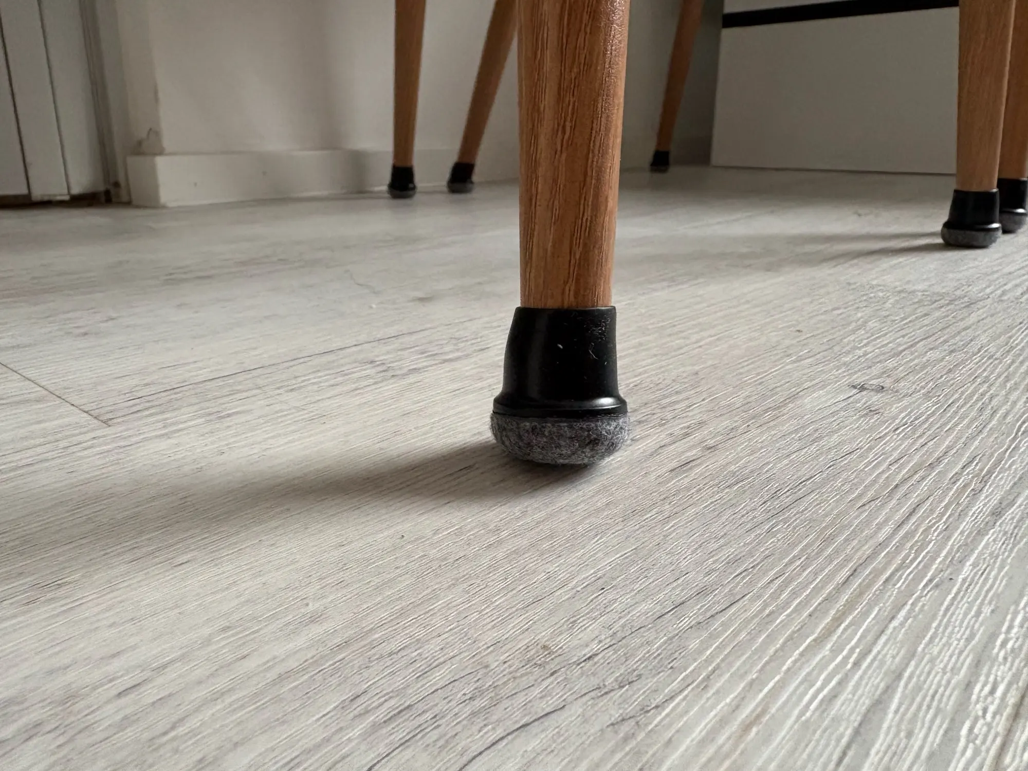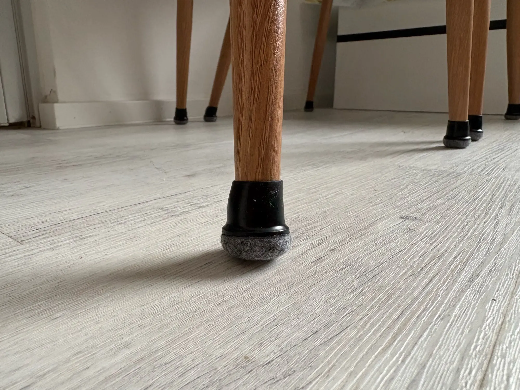 Excellent chair feet, they are elastic and adapt well to any leg even if it’s not round. Then the Veltrones that touch the floor make the chair slide very smoothly.
