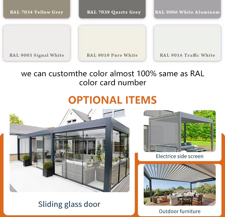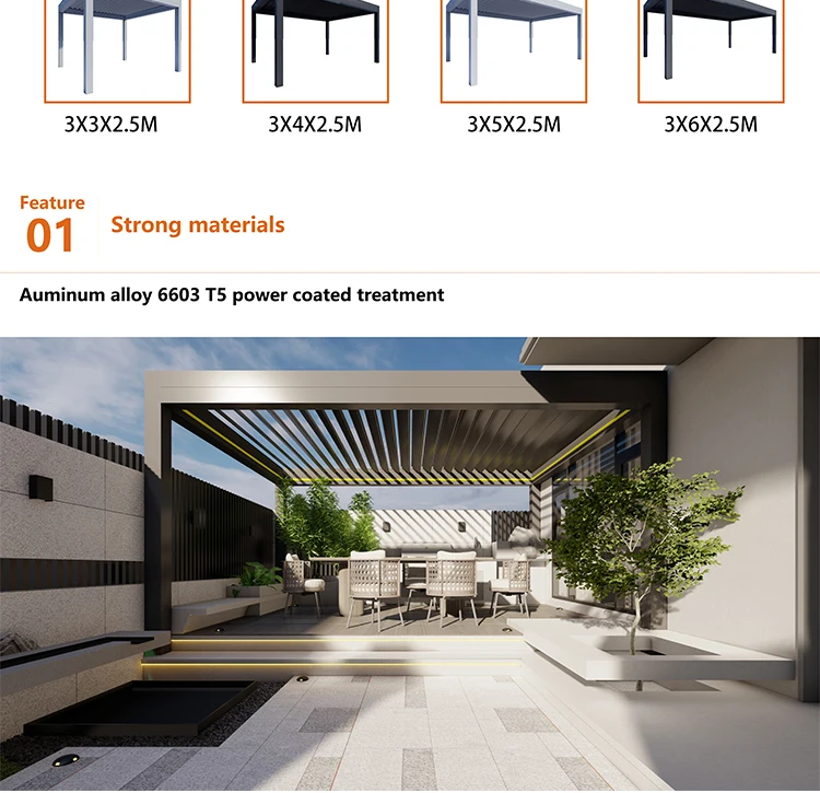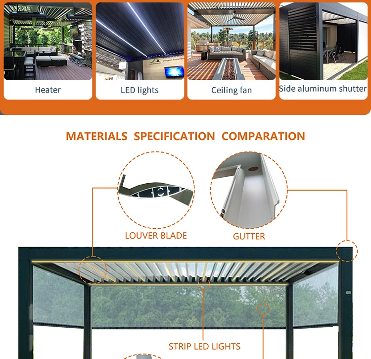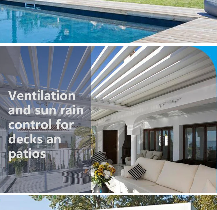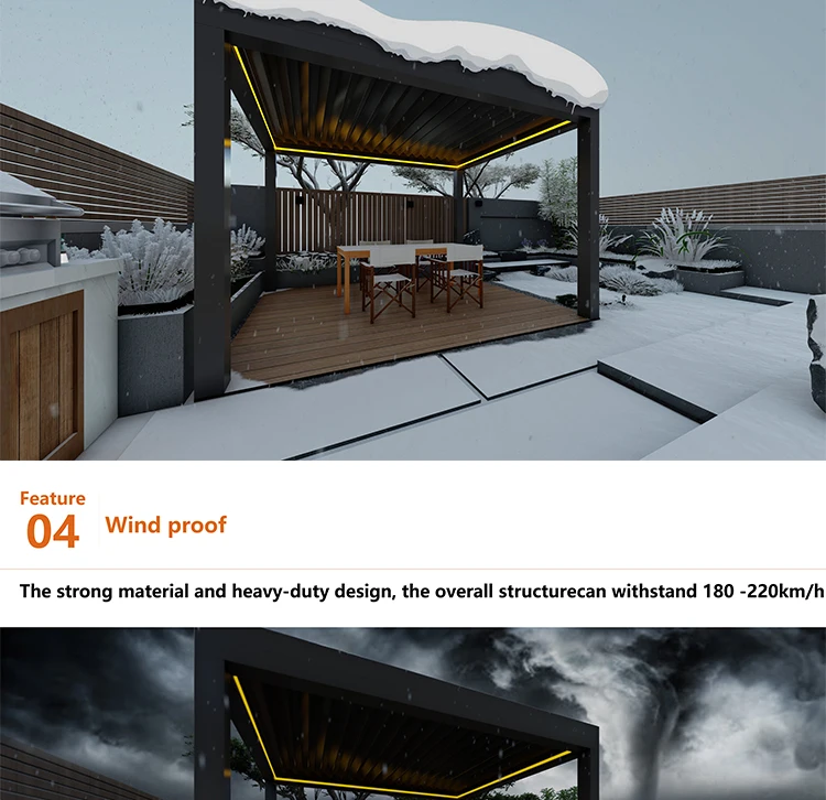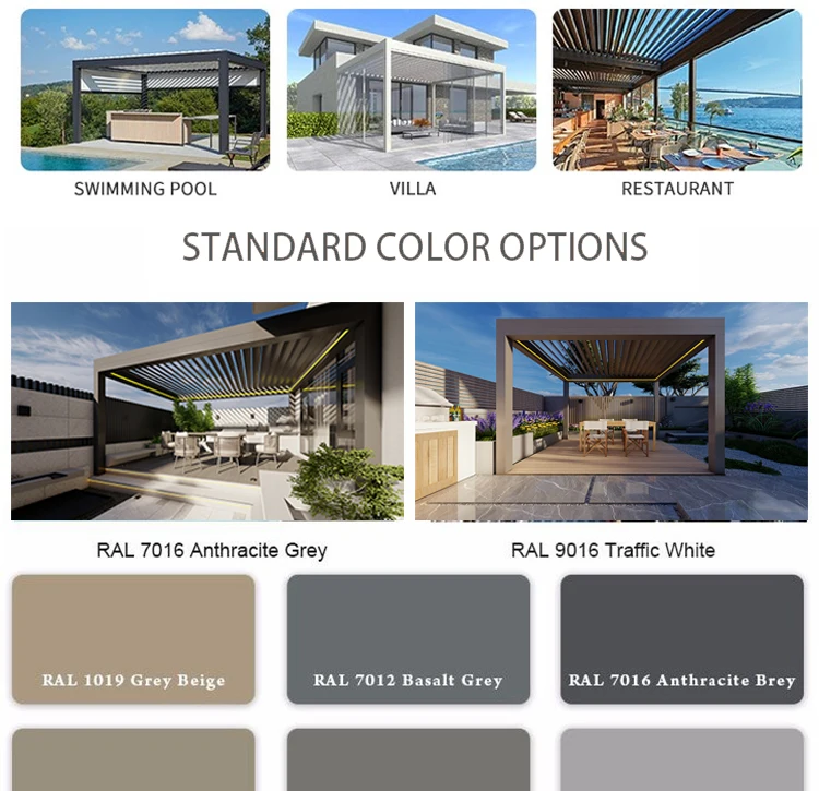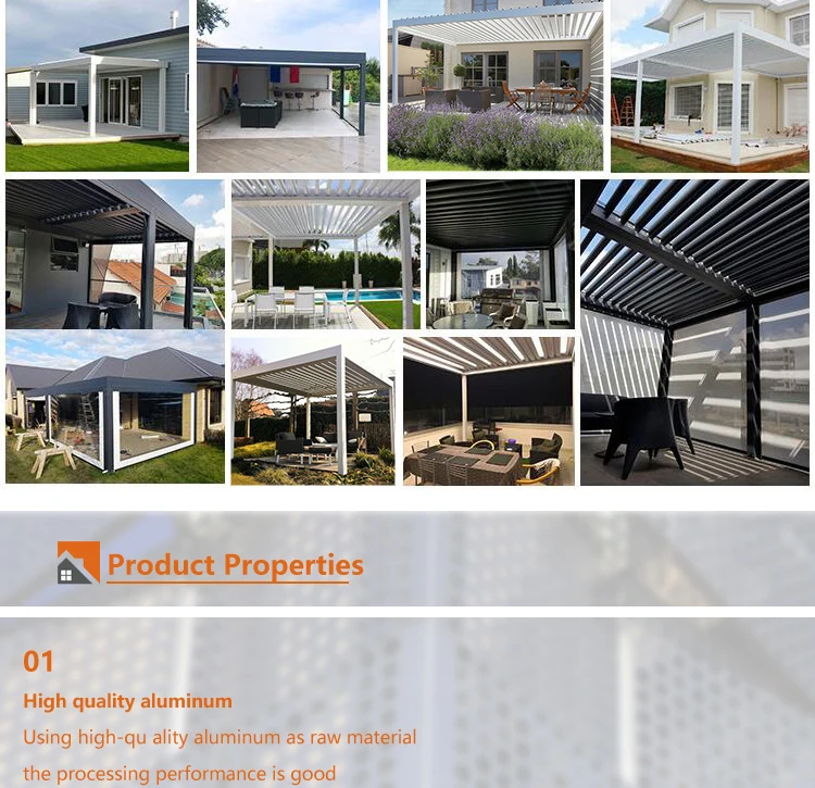 Aluminum pergola, rainproof, electrically adjustable gazebo, electric louvered awning, outdoor patio sunshade.