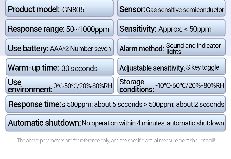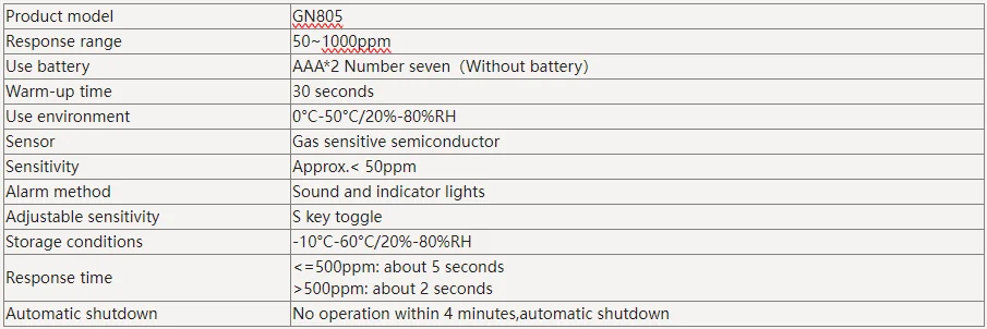 Response time:<500PPM (approximately 5 seconds);> 500PPM (approximately 2 seconds).
