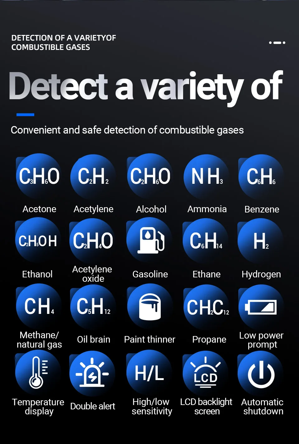 Acetone, acetylene, alcohol, ammonia, benzene, ethanol, epoxyacetylene, gasoline, hexane, hydrogen, methane, petroleum gas, natural gas, paint thinner, propane, solvents, etc.