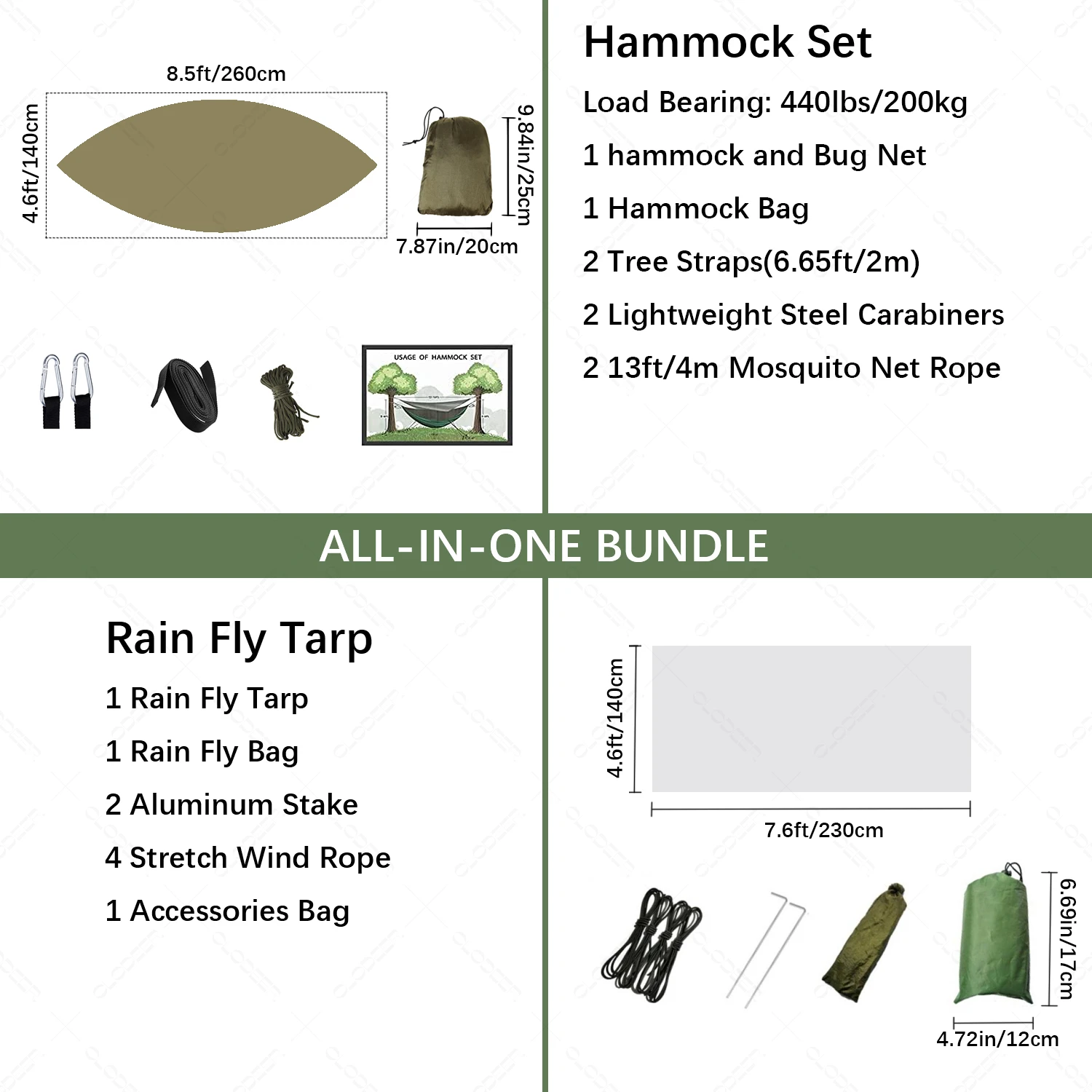 Your hammock can be used in sunny and rainy days. Rain fly tarp can protect you from the sun &rain. We’re upgrade the hammock tarp size to 90.5inch(230cm) x 55.1inch(140cm) (Length x width). It can be folded into the storage bag, or use it separately as a tent or picnic mat.