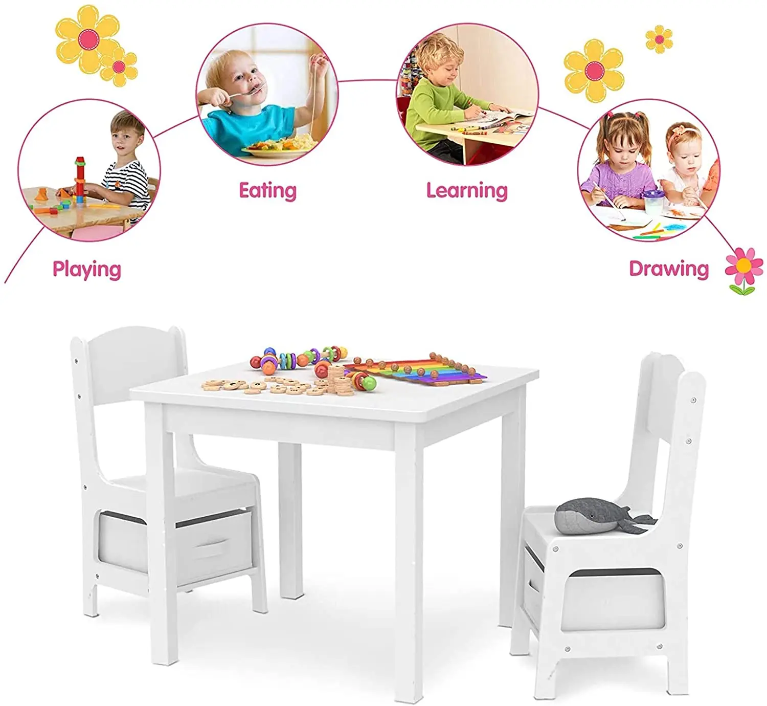 • LARGE STORAGE – There are built-in storage boxes under the table top and chairs. The under table storage bin can be used as a building block box. Side lift-up slot design is convenient for use and conversion, and is very useful for saving space and get into the habit of storing things as you go. There are removable foldable drawers under the chairs, which can store your child’s toys, books, crayons and more.