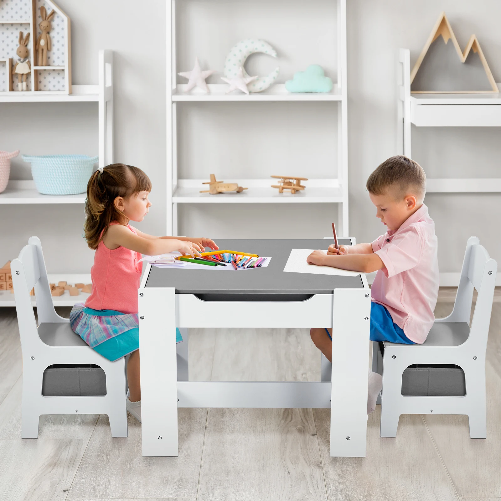 Be the first to review “AOOU Kids Table and 2 Chairs Set, 3-in-1 Wooden Activity Table, w/Detachable Storage Drawer, Drawing Reading Black Board Desk”