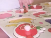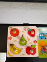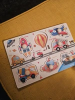 Puzzle with large, colorful wooden pieces. Very useful for entertaining children. The pieces are large and have a wooden stand to help with handling.