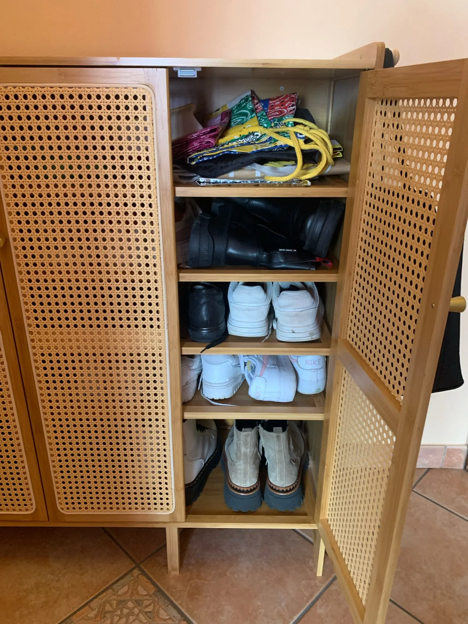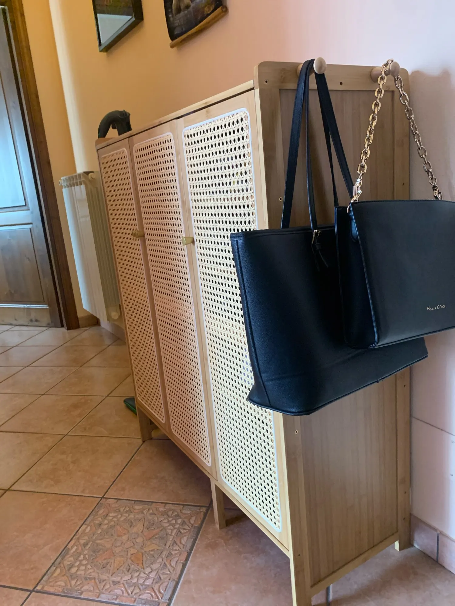 Light and easy to assemble furniture! It’s super elegant, colonial style. It fits perfectly in my home entrance and it has enough deepens for high size shoes. I love the fact that you can place shoes under it, hang umbrellas or bags on the sides and also it’s breathable! I am very satisfied with it and very happy to see it in my house 🙂
