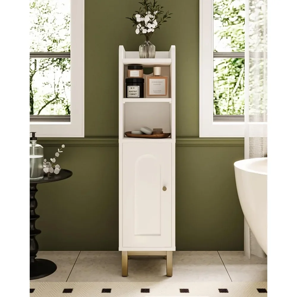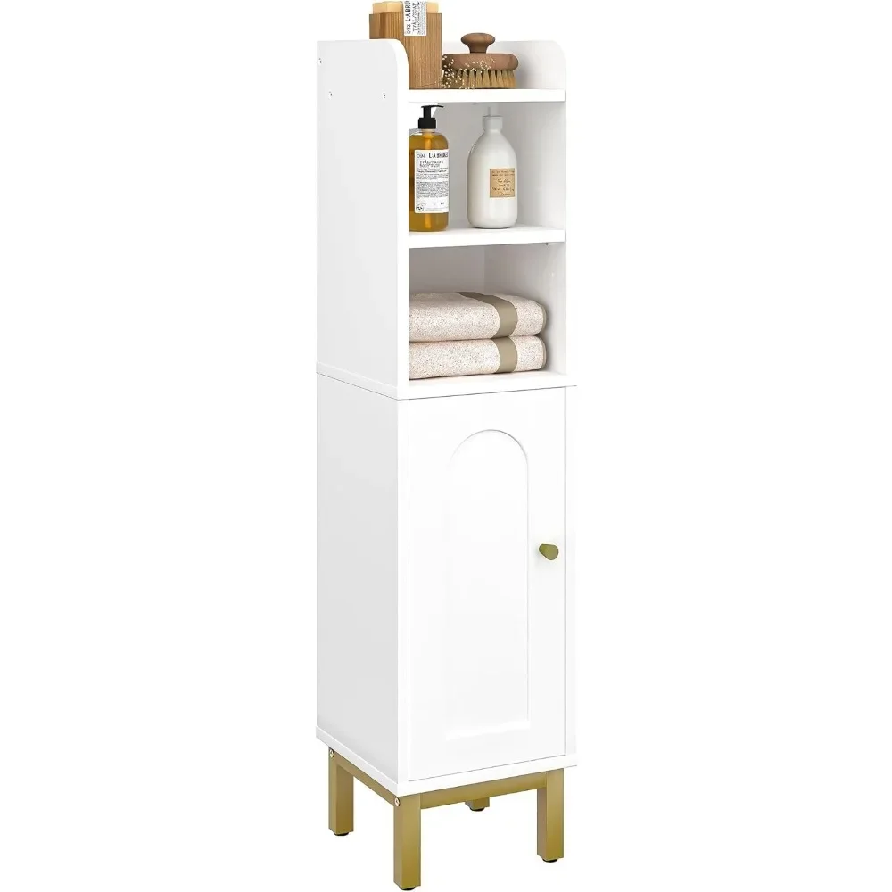 Suitable for Narrow Spaces: This sleek and space-saving bathroom cabinet, measuring 7.9″D x 7.9″W x 32.6″H, fits perfectly in narrow spaces, arched door design and four golden legs adding an aesthetic touch to your bathroom.