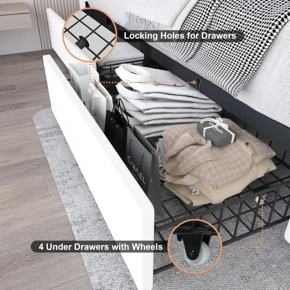 Upholstered Bed with 4 Large Drawers: Comes with 4 drawers with rollers under the storage bed, this full bed frame with headboard provides convenient storage space for keeping your off-season clothing organized. Each drawer is measured 27.56″L * 19.69″W * 5.31″H
