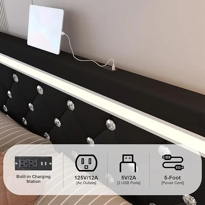 Charge Station: Elevate your bedroom decor with button tufted headboard and UL Certified built-in USB and charge station. Each USB port delivers a speedy 5V/2A MAX output.
