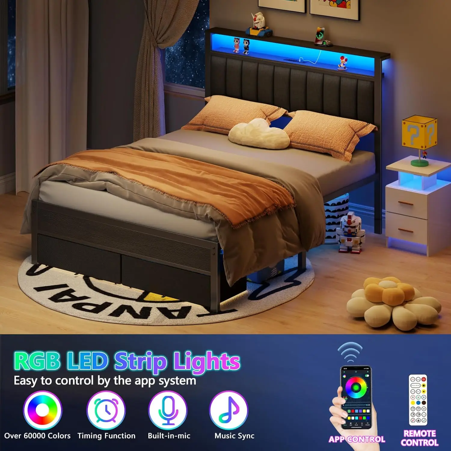 Dynamic LED Lights: Transform your bedroom atmosphere with RGB LED lights embedded in the bed frame. With over 60,000 color options and various modes, including music synchronization and timer settings, you can create a customized ambiance that appeals to both girls and boys, making bedtime fun and engaging.