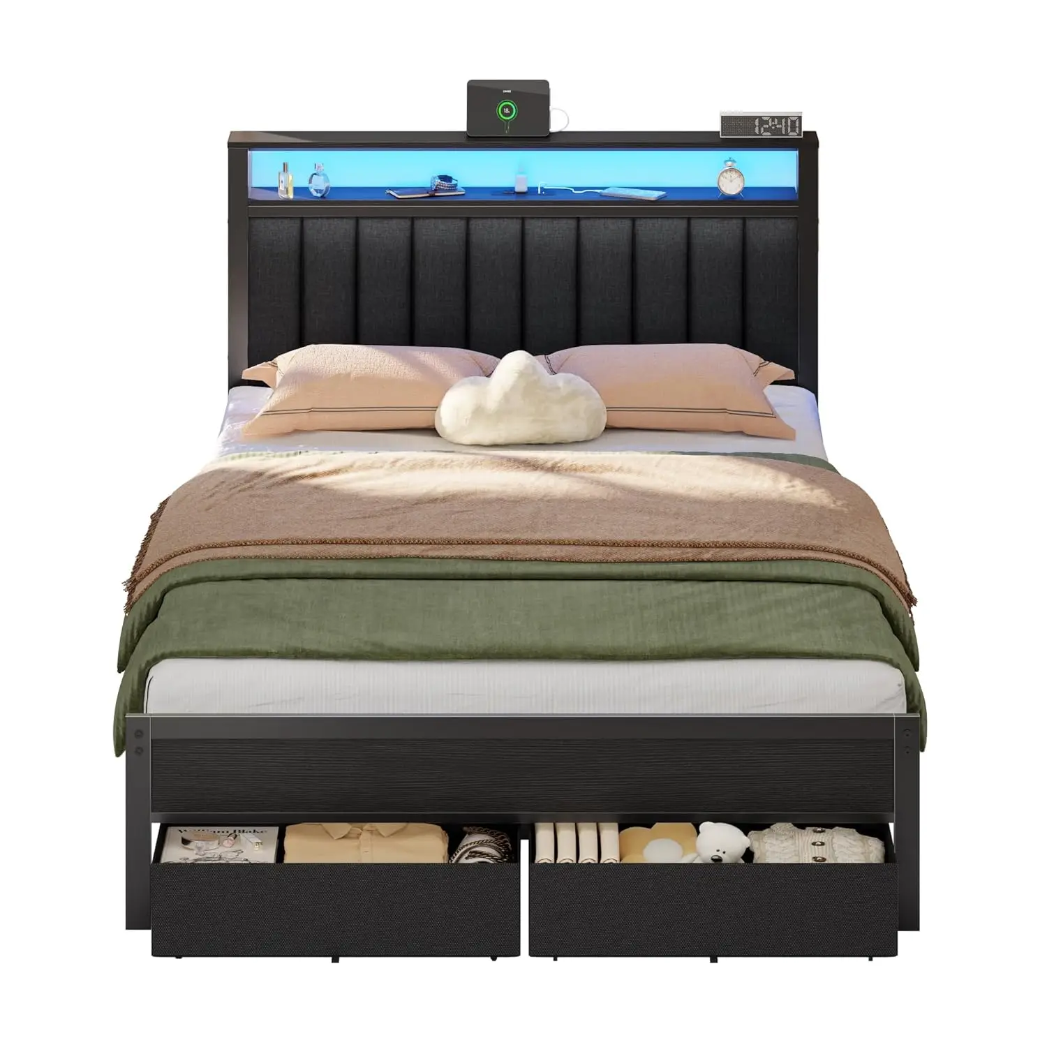 3 reviews for Bed Frame with Charging Station and LED Lights, Grey Upholstered Headboard with Shelves, Metal Platform Bed, Customized