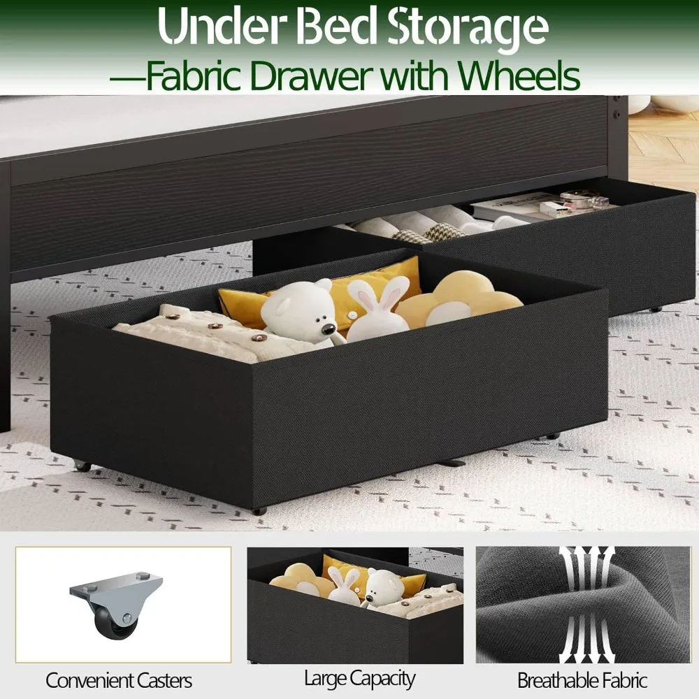 Under Bed Storage Drawers: Maximize your bedroom space with our innovative queen size platform bed designed with two under bed storage drawers on wheels. These lightweight containers are perfect for organizing toys, clothes, or bedding, keeping your room tidy and clutter-free while providing easy access whenever needed.