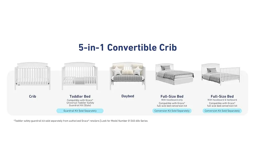 - 5-IN-1 CONVERTIBLE CRIB: Converts from baby crib (mattress sold separately) to toddler bed [Universal Toddler Safety Guardrail Kit (01340-60x Series) sold separately], daybed, and full-size bed (Full-Size Bed Conversion Kit sold separately)