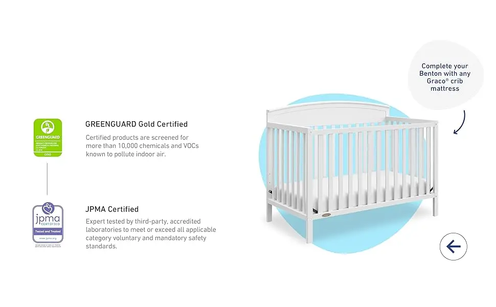 - GREENGUARD GOLD CERTIFIED, JPMA CERTIFIED: GREENGUARD Gold Certified products are screened for more than 10,000 chemicals and VOCs known to pollute indoor air; Expert tested to meet or exceed all applicable category voluntary and mandatory safety standards